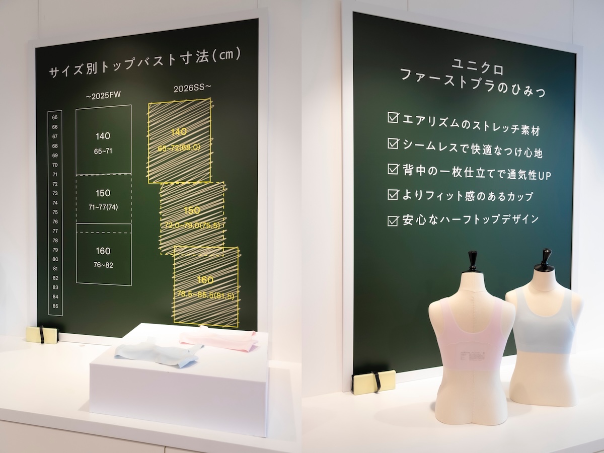 ユニクロは、2026年春に“エアリズムファーストブラ”をリニューアルした。目指したのは、成長期を迎える女の子の身体と心の変化に寄り添うこと。その開発背景や商品に込めた思いを伝える場として3月25日に「ファーストブラ リニューアル発表会」を開催した。商品のリニューアルポイントの説明のほか、同社が母親と子どもを対象に実施したアンケートの調査報告を見ながらの、グローバル商品本部キッズMD部の松崎里美部長と産婦人科医の高尾美穂医師によるトークセッションが行われた。