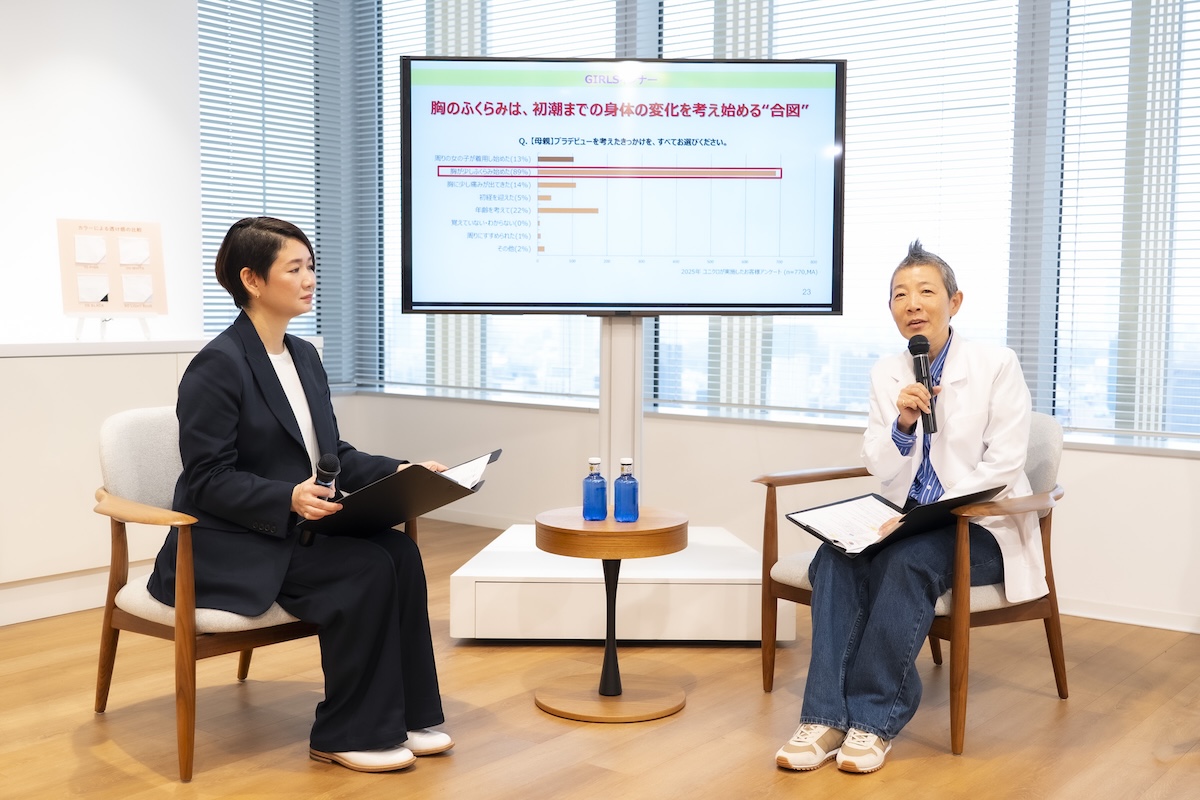 松崎部長と産婦人科医の高尾医師のトークセッションでは、ファーストブラに関するユニクロ独自調査アンケートが報告された。
