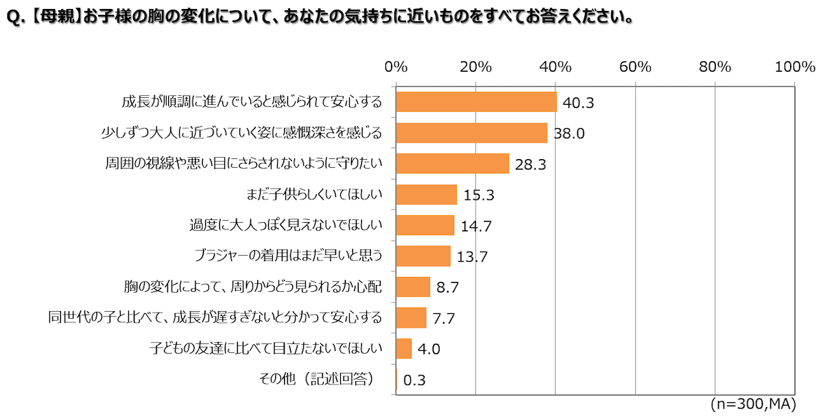 また、「胸の変化について、あなたの気持ちに近いものをすべて教えてください」という子どもへの問いには、「体操服やTシャツを着たときに、胸の形が出るのが気になる」が28%、「友達と比べて目立ちたくない」が22%、「胸のふくらみが服の上から目立ちそうで気になる」22%と、からだの変化に揺れ動く思春期ならではの心情が浮き彫りになった。