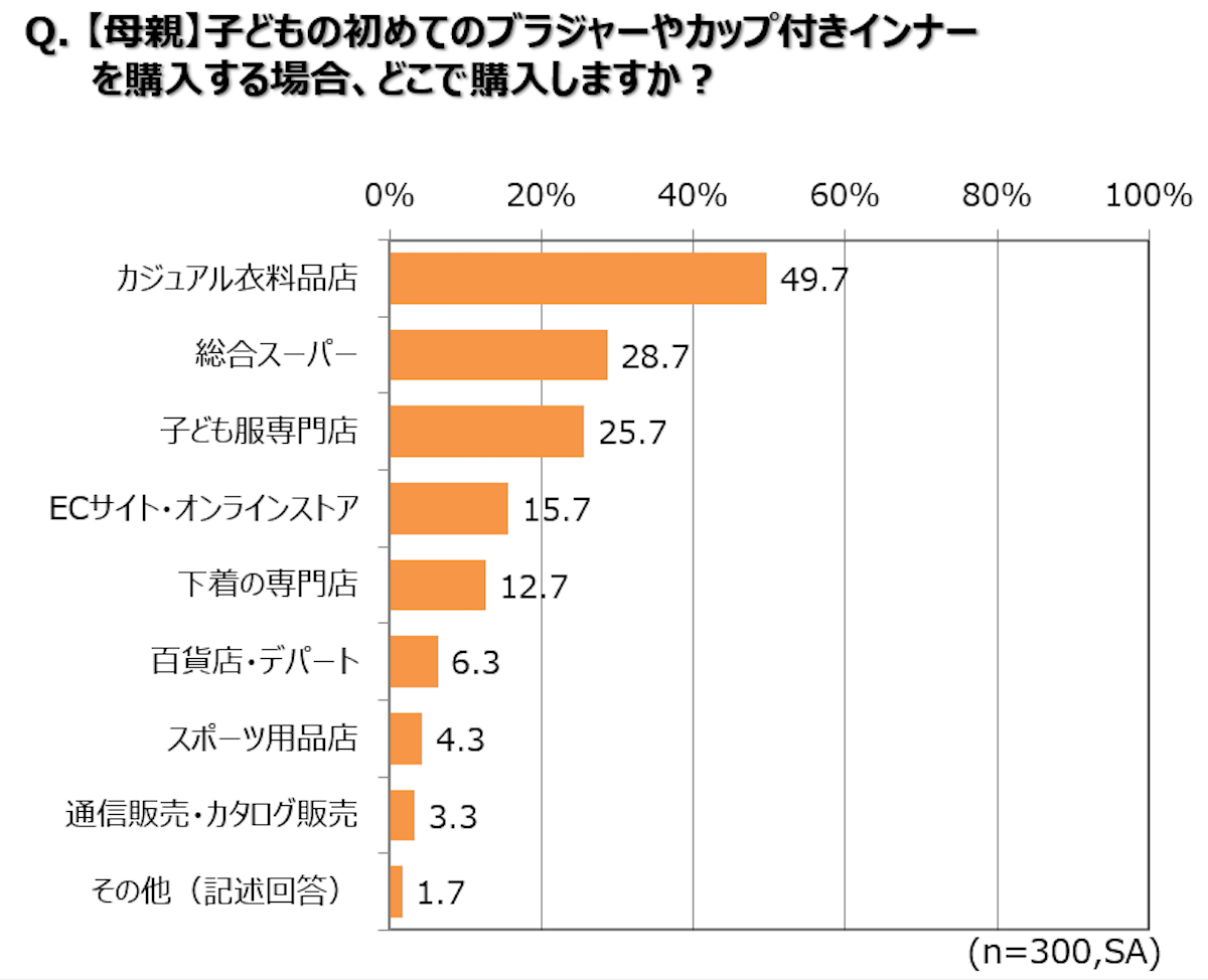 母親に「子どもの初めてのブラジャーやカップ付きインナーを購入する場合、どこで購入しますか?」との問いには、「カジュアル衣料品店」が49.7%でトップとなった。ファーストブラについて会話したり購入するきっかけを作ったりするのは、親子ともに意外に難しかったりする。「わざわざファーストブラを買いに行く」のではなく、「日常の延長である買い物のついでに、いつものユニクロで購入する」という流れはスムーズで、初めての一歩を踏み出すハードルも下がりそうだ。