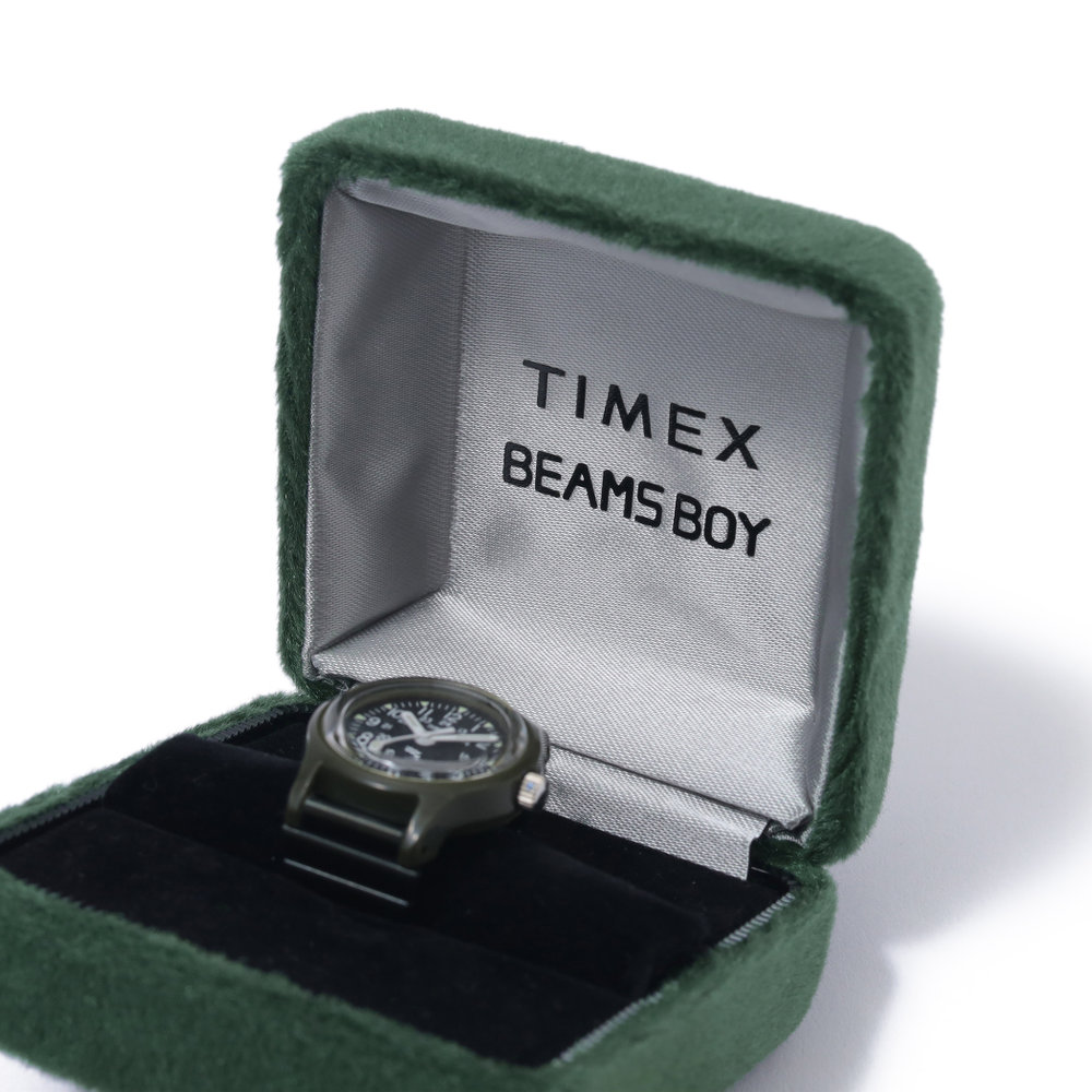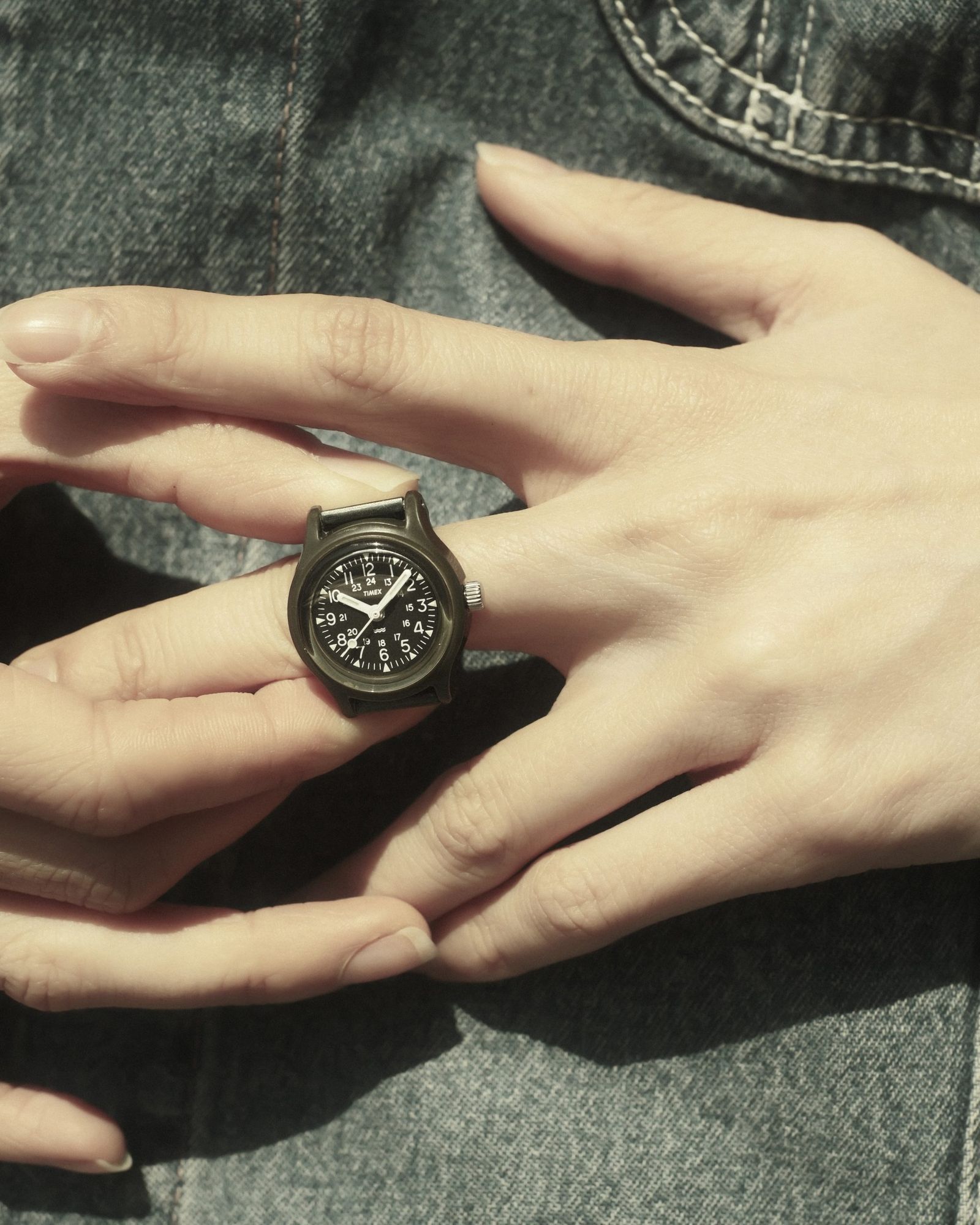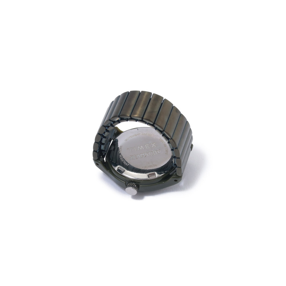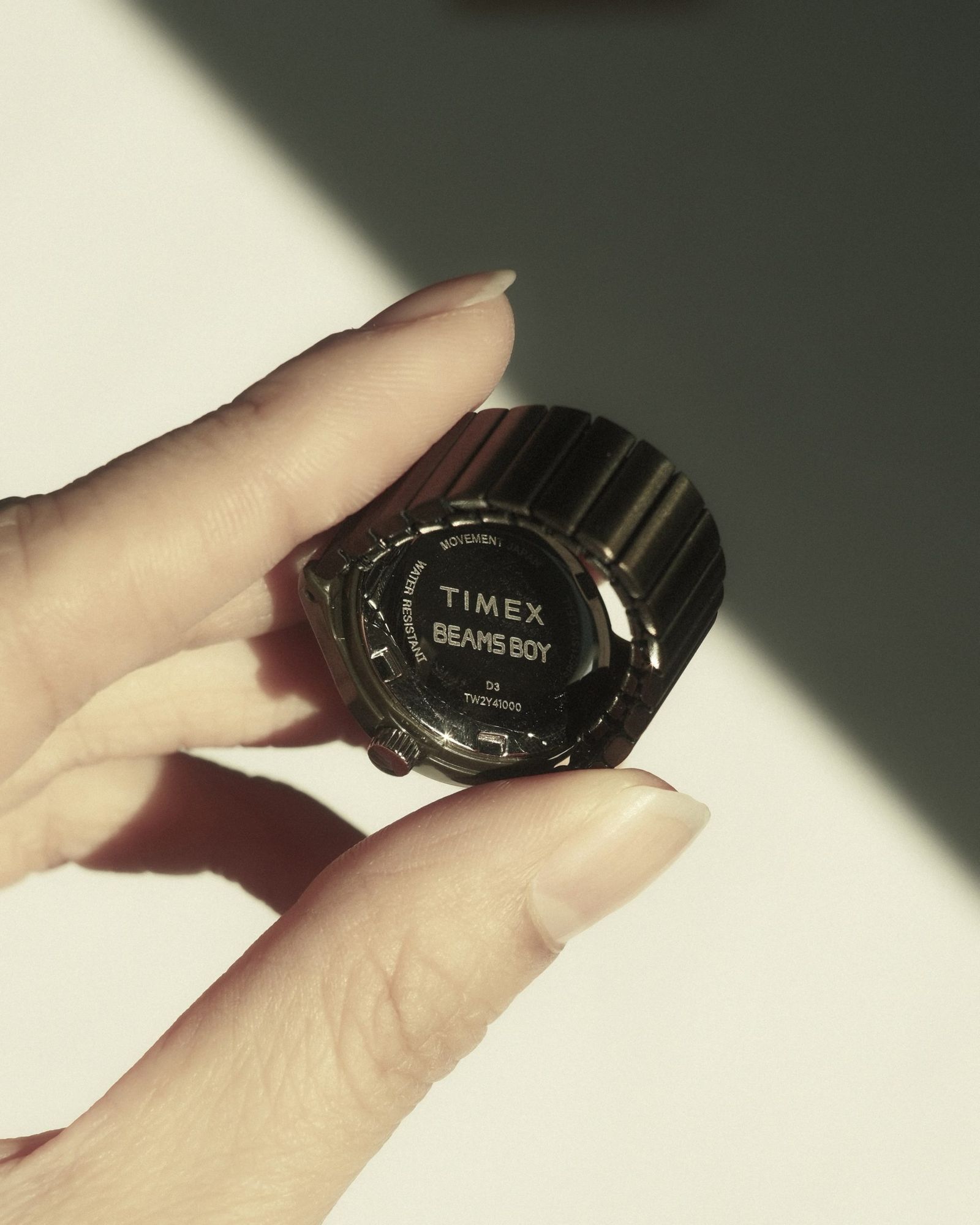 本作は、「ビームス」の創業50周年を記念したアイテム。「タイメックス」を代表するミリタリーウオッチ “オリジナル キャンパー”をベースに、1990年代に展開していたリング型ウオッチのデザインを着想源として再構築した。