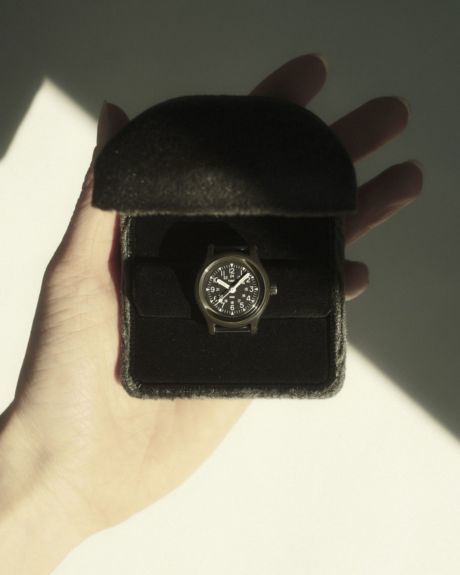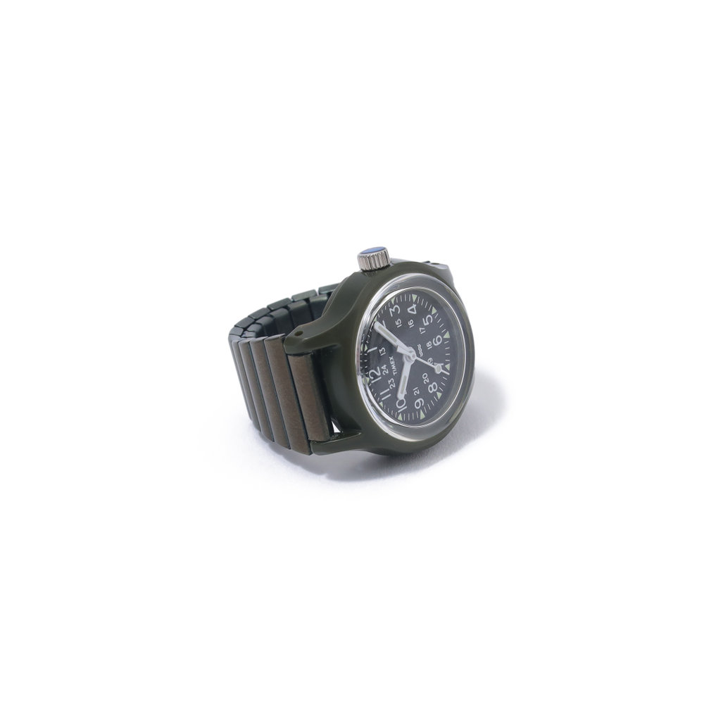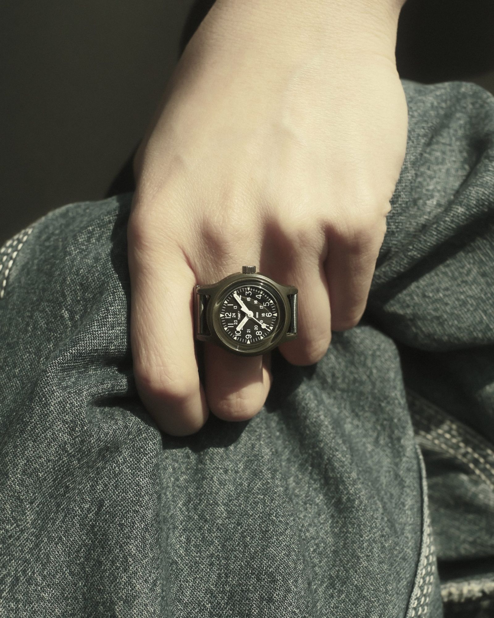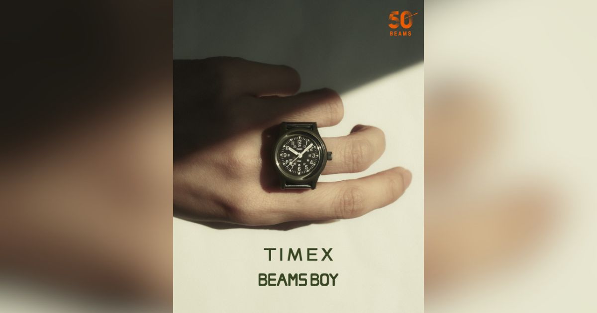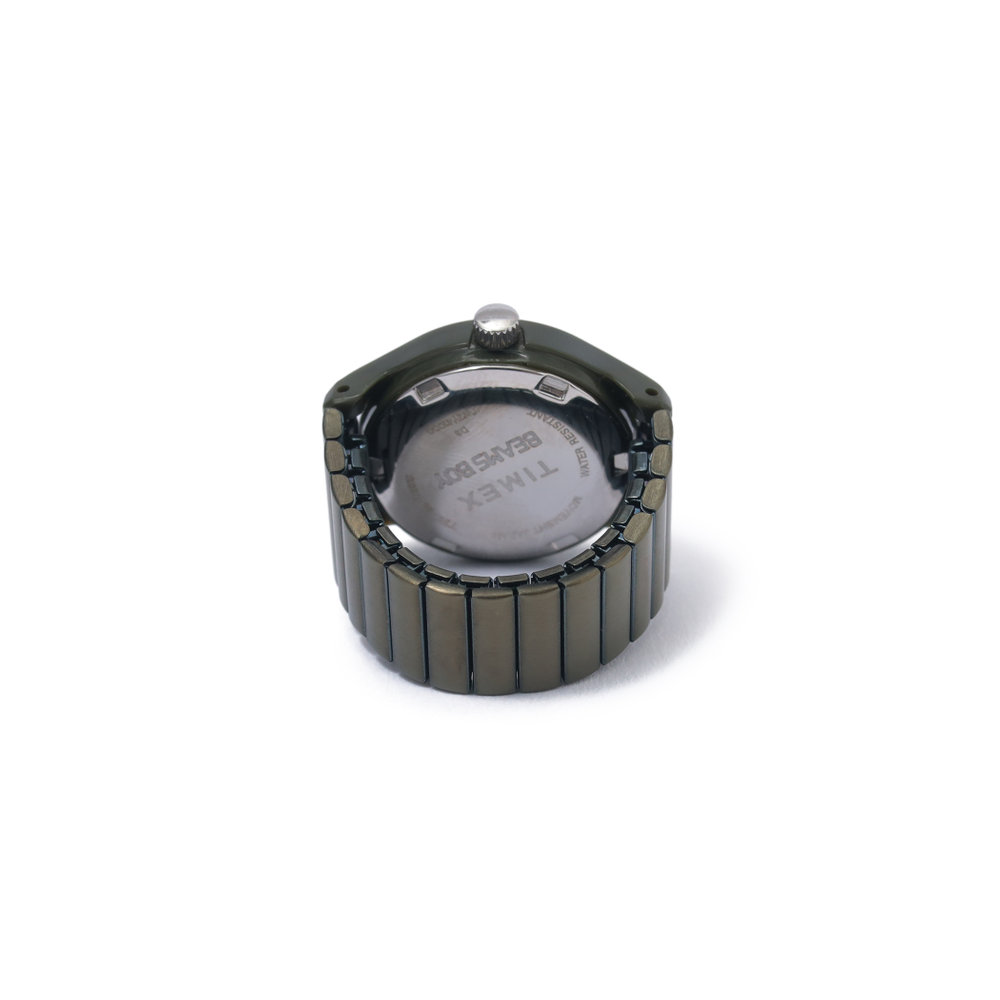 本作は、「ビームス」の創業50周年を記念したアイテム。「タイメックス」を代表するミリタリーウオッチ “オリジナル キャンパー”をベースに、1990年代に展開していたリング型ウオッチのデザインを着想源として再構築した。