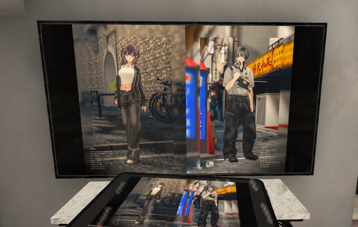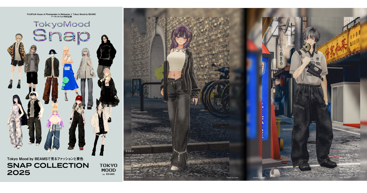 ファッションスナップは、VRChatでリアルクローゼットに近いバーチャルファッションを楽しむ定期集会「リアクロ集会」を25年9年に同ワールドを会場にして行った際に、2人のVRフォトグラファーが撮ったものと、Xで公募した同ワールドで撮影されたファッションスナップの中からVRチームのメンバーで選んだ。「まず直感的に“刺さる”ものを抽出し、その後、全体のバランスを見ながら整えていった。リアルクローズを主軸に、ビームスらしさを感じさせるスタイルを優先。VRならではの極端にファンタジックなものはあえて外し、男性・女性アバターの比率やテイストの幅も考慮した。同系統ばかりにならないよう、多様なストリートファッションを提示することを意識した」。