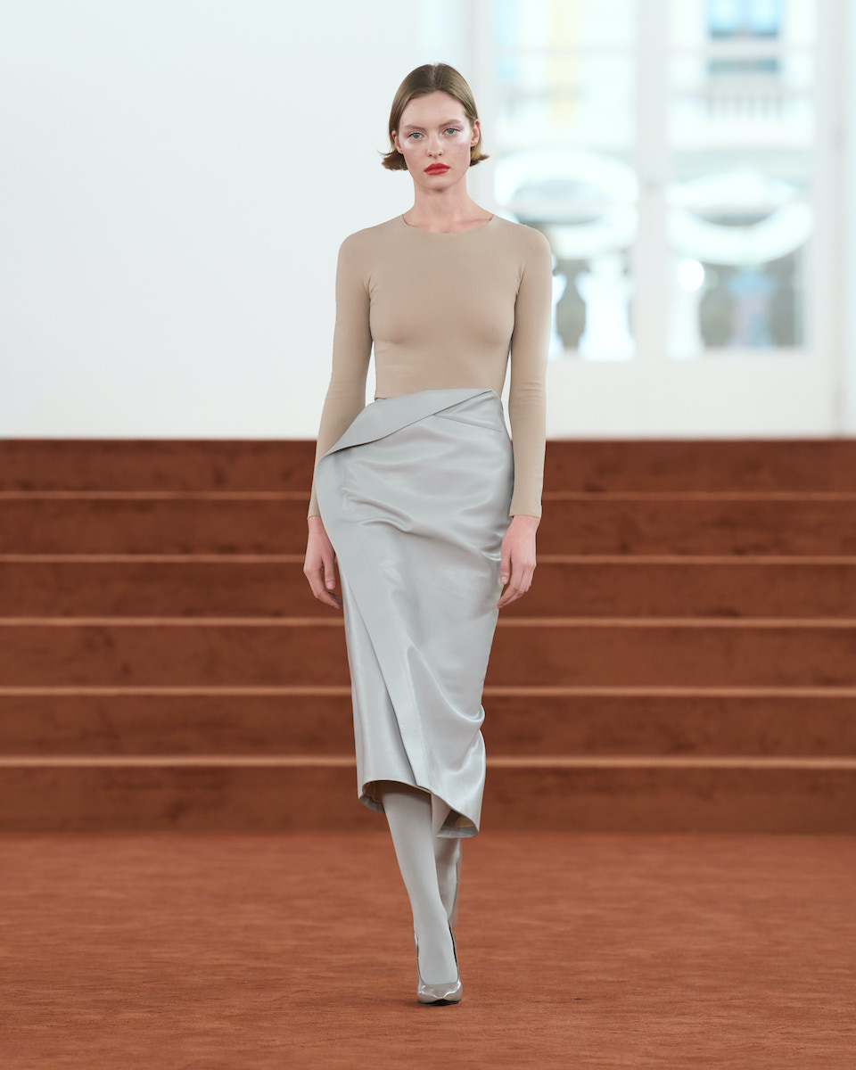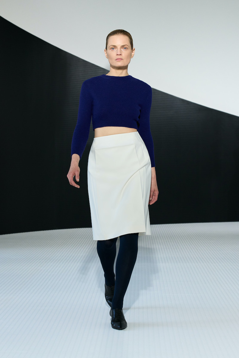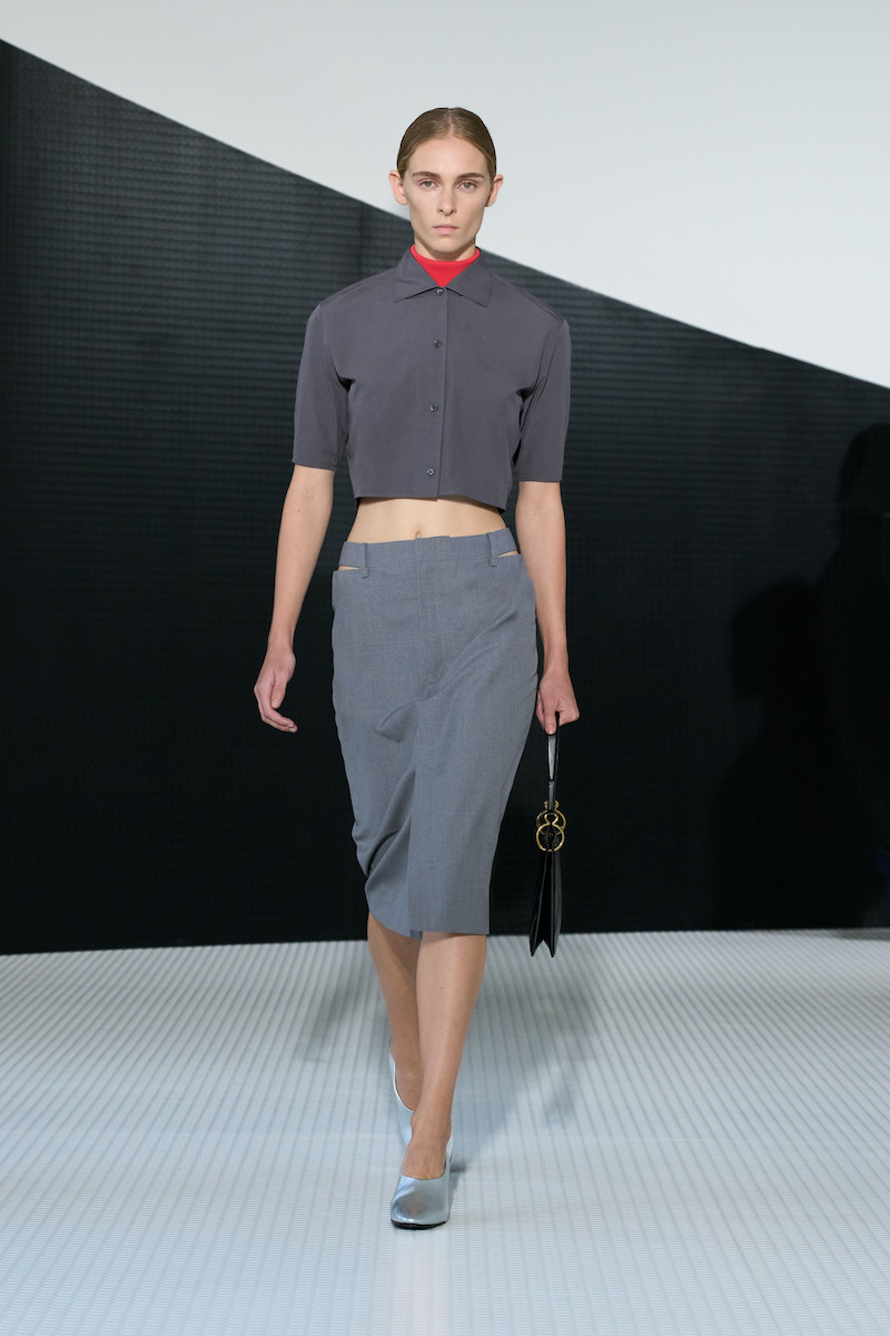 ベロッティ:厳格なまでの純粋さを軽やかに見せるため、「ジル サンダー」は元来、肌を見せることが多かった。過去の広告ビジュアルなども、腕やウエストなどを見せている。私はそこに、ある種の官能性を感じた。「ジル サンダー」は、体をスタイルの一部として見せているからモダンなんだ。もちろんタートルネックを着たり、ボタンを一番上まで留めたりもスタイルコードだが、「ジル サンダー」には「オープン」というスタイルコードもある。軽やかなのに官能的、加えてエレガントというのは、とても難しい。でも私は今、その挑戦、理想のバランスを追求することを楽しんでいる。