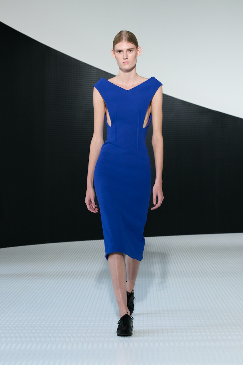 WWD:そこで最初のコレクションは、厳かさを感じるほどに削ぎ落としたスタイルにスリットなどのディテールを加えた。