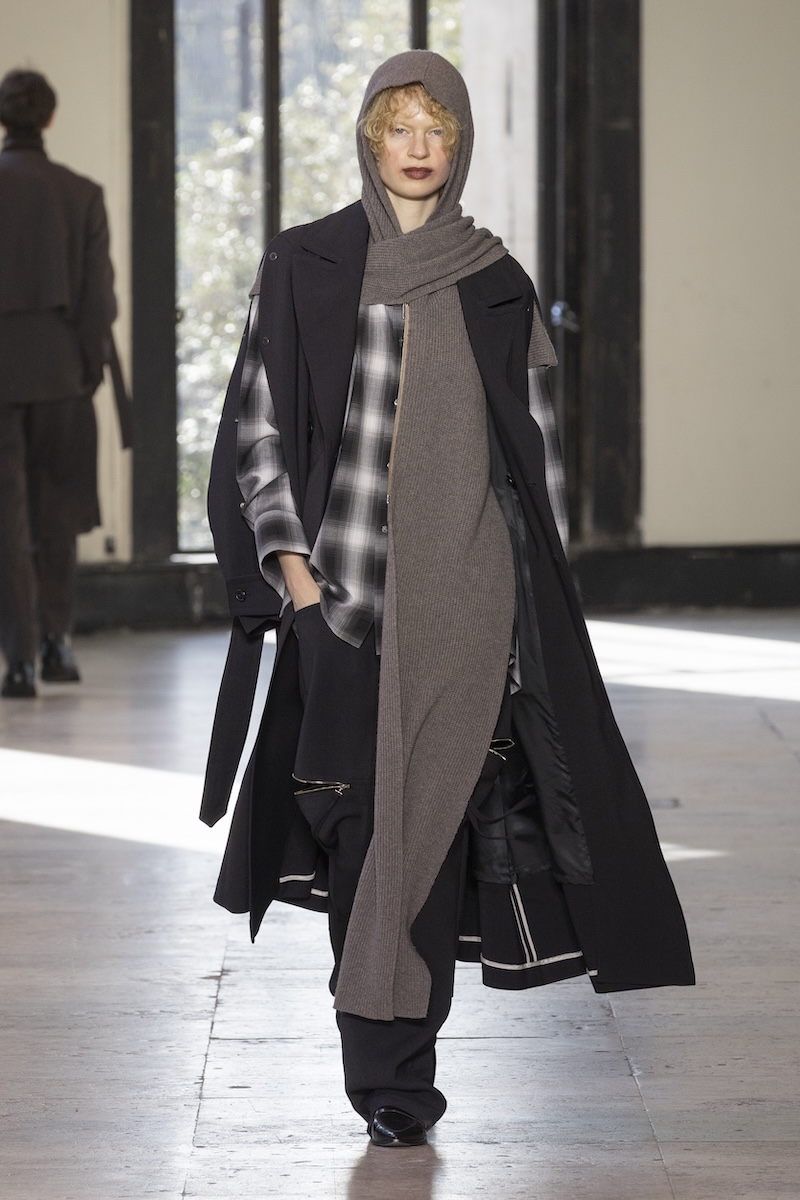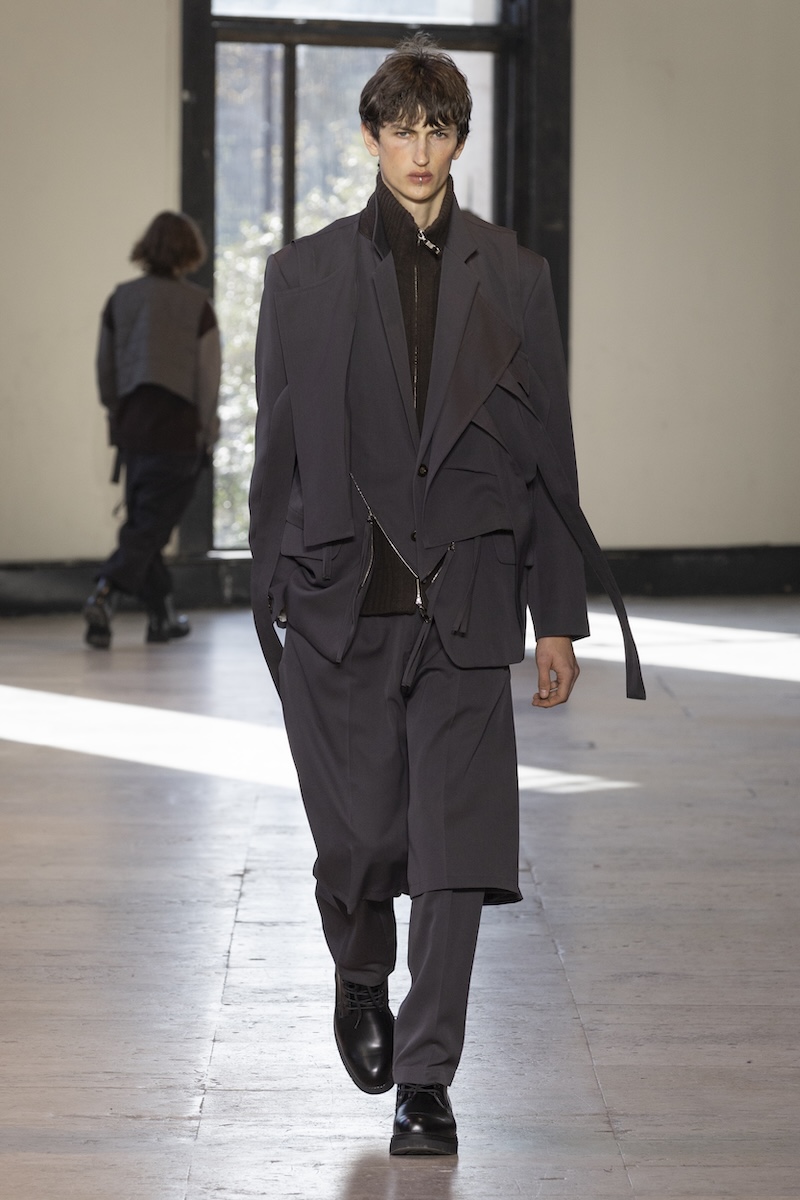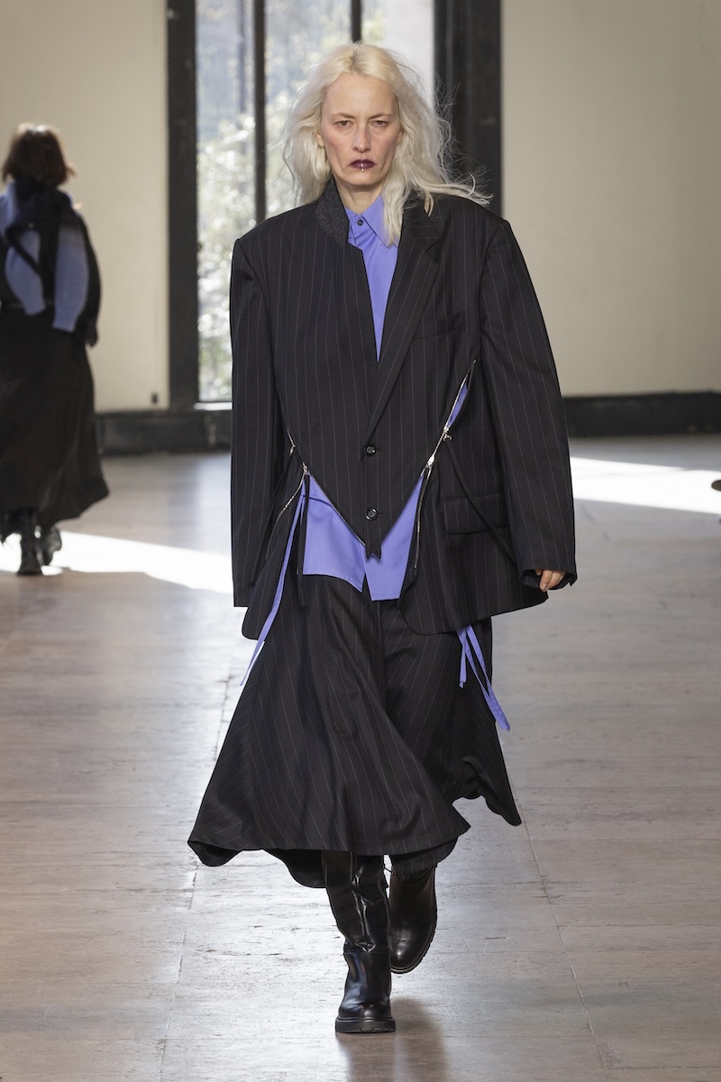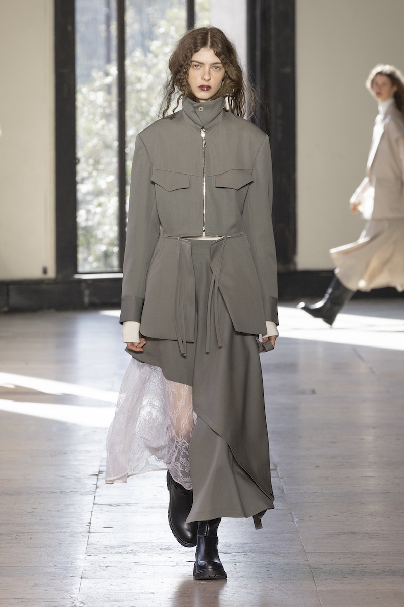 とはいえ、ベースは変わらずブランドの象徴であるテーラリングを軸にしたレイヤード。ただ、いつも以上に服に動きやシルエットの変化をもたらすデザインが盛り込まれているように感じます。特に印象的だったのは、ジャケットの前身頃にV字を描くように斜めに加えたファスナー。スカートのサイドにも水平にファスナー開閉があったり、フライトジャケットの袖がボタンで脱着可能だったり、コートの袖がボタン開閉になっていたりと、ますます拡大するルールに縛られないスポンテニアス(自発的)な着こなしを後押しするようなデザインが満載です。