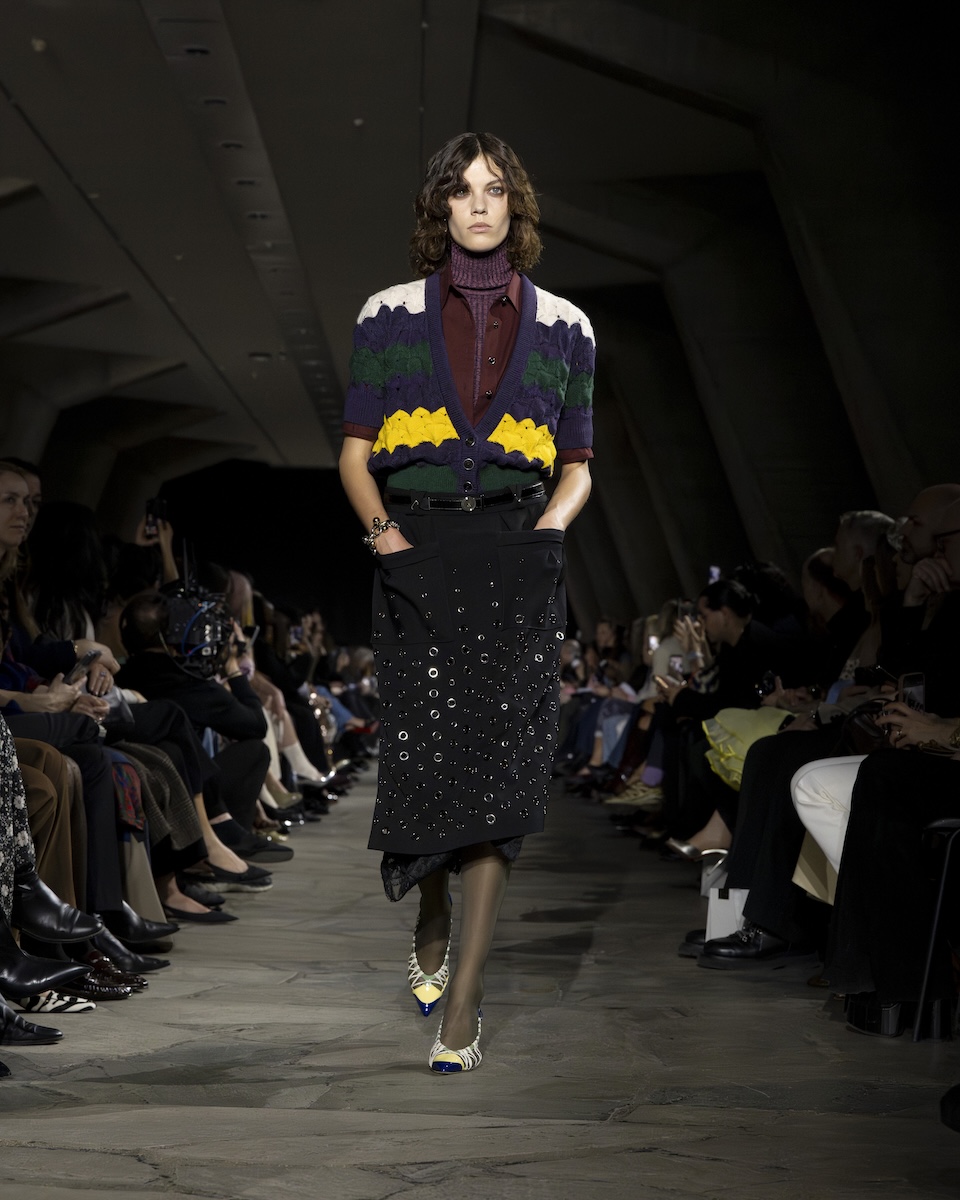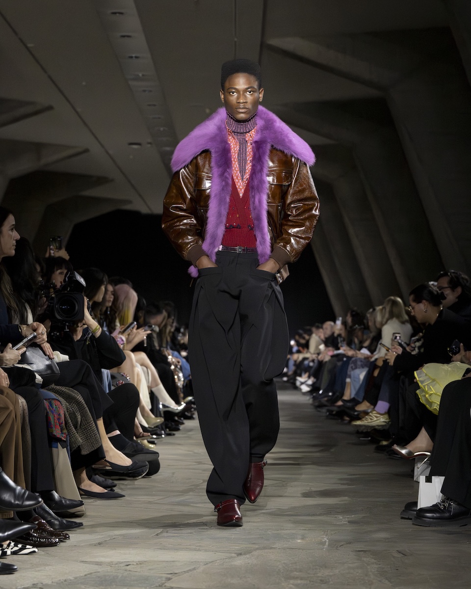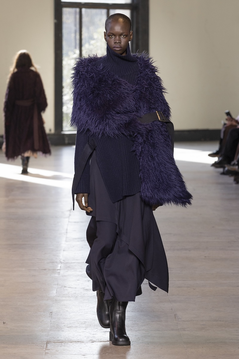 とはいえ、ベースは変わらずブランドの象徴であるテーラリングを軸にしたレイヤード。ただ、いつも以上に服に動きやシルエットの変化をもたらすデザインが盛り込まれているように感じます。特に印象的だったのは、ジャケットの前身頃にV字を描くように斜めに加えたファスナー。スカートのサイドにも水平にファスナー開閉があったり、フライトジャケットの袖がボタンで脱着可能だったり、コートの袖がボタン開閉になっていたりと、ますます拡大するルールに縛られないスポンテニアス(自発的)な着こなしを後押しするようなデザインが満載です。