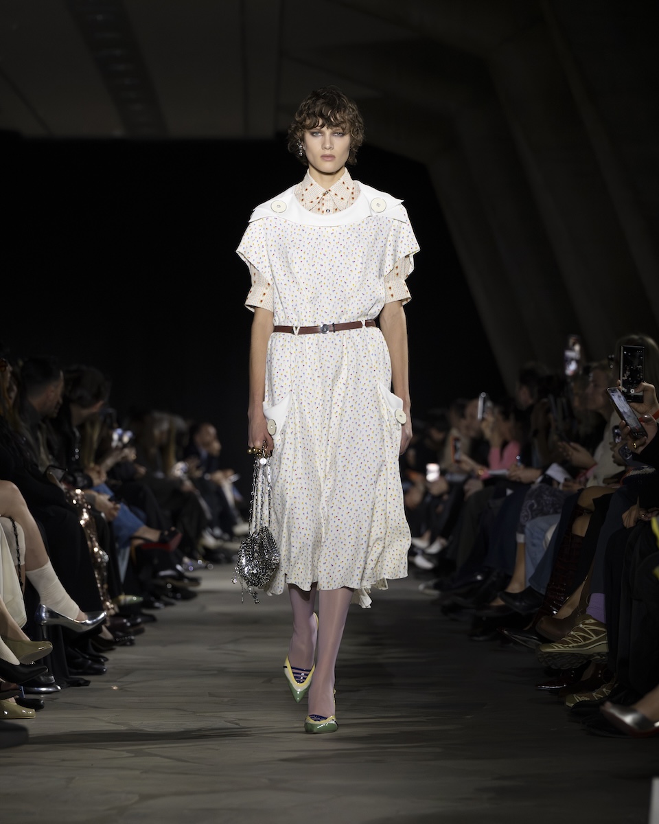 「ラバンヌ」は、ビンテージライクなアイテムや色柄を組み合わせたレイヤードスタイルで、シーズンを象徴するノスタルジックなムードに合流しました。今季のクリエイションの背景にあるのは、「磨き上げられすぎた完璧さから距離を置く姿勢こそが、モダンなフェミニニティー」だというジュリアン・ドッセーナ(Julien Dossena)=クリエイティブ・ディレクターの考え。さまざまな時代のエッセンスを取り込み、再構築するアプローチを通して“今”の美学を表現し、現代を生きる人々の個性を際立たせるための着こなしを提案しました。