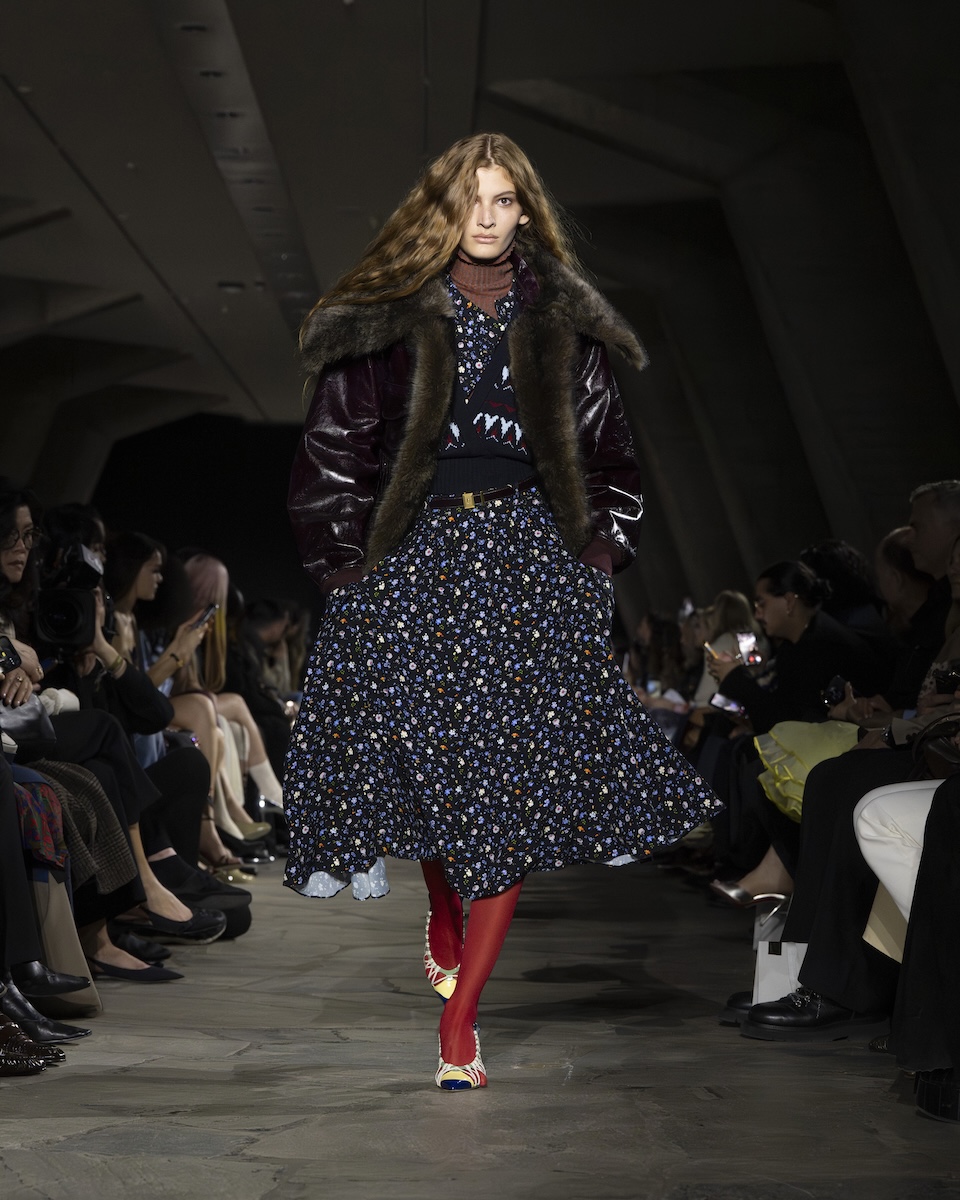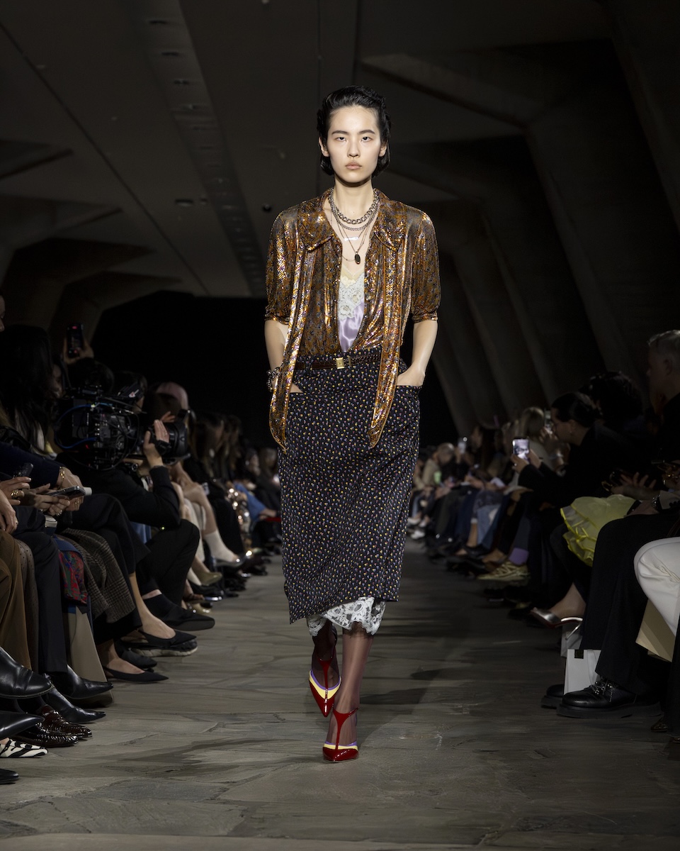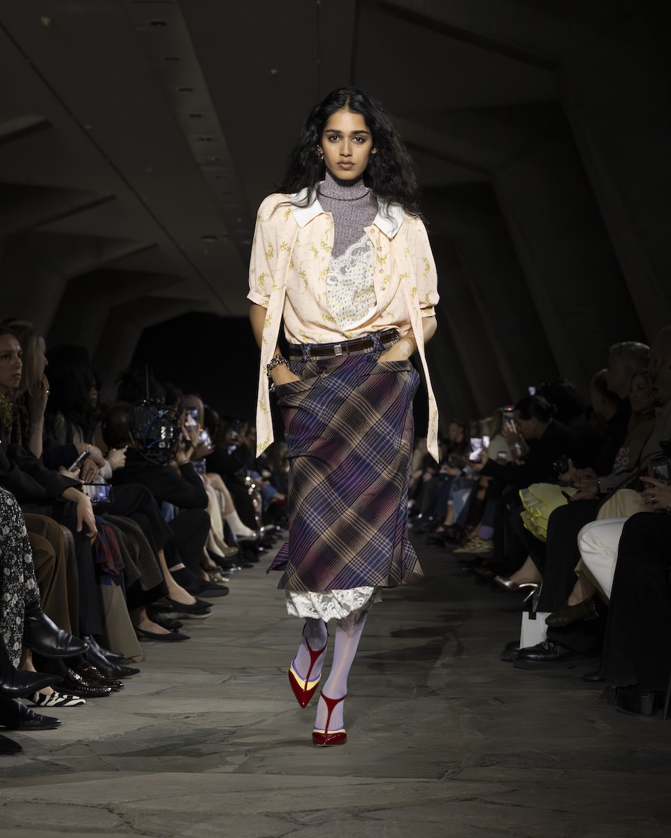 ショーは、レトロなプリントを施した控えめなパフスリーブのブラウスと1940年代風のティードレスを重ねたルックからスタート。その後も、フェアアイル柄のハーフジップセーターの上にセンシュアルなドレスをコーディネートしたり、タートルネックセーターとレーストリムのキャミソール、ボウタイ付きブラウス、チェックのミディスカートを組み合わせたりと、レイヤードを軸にした自由なスタイリングが光ります。