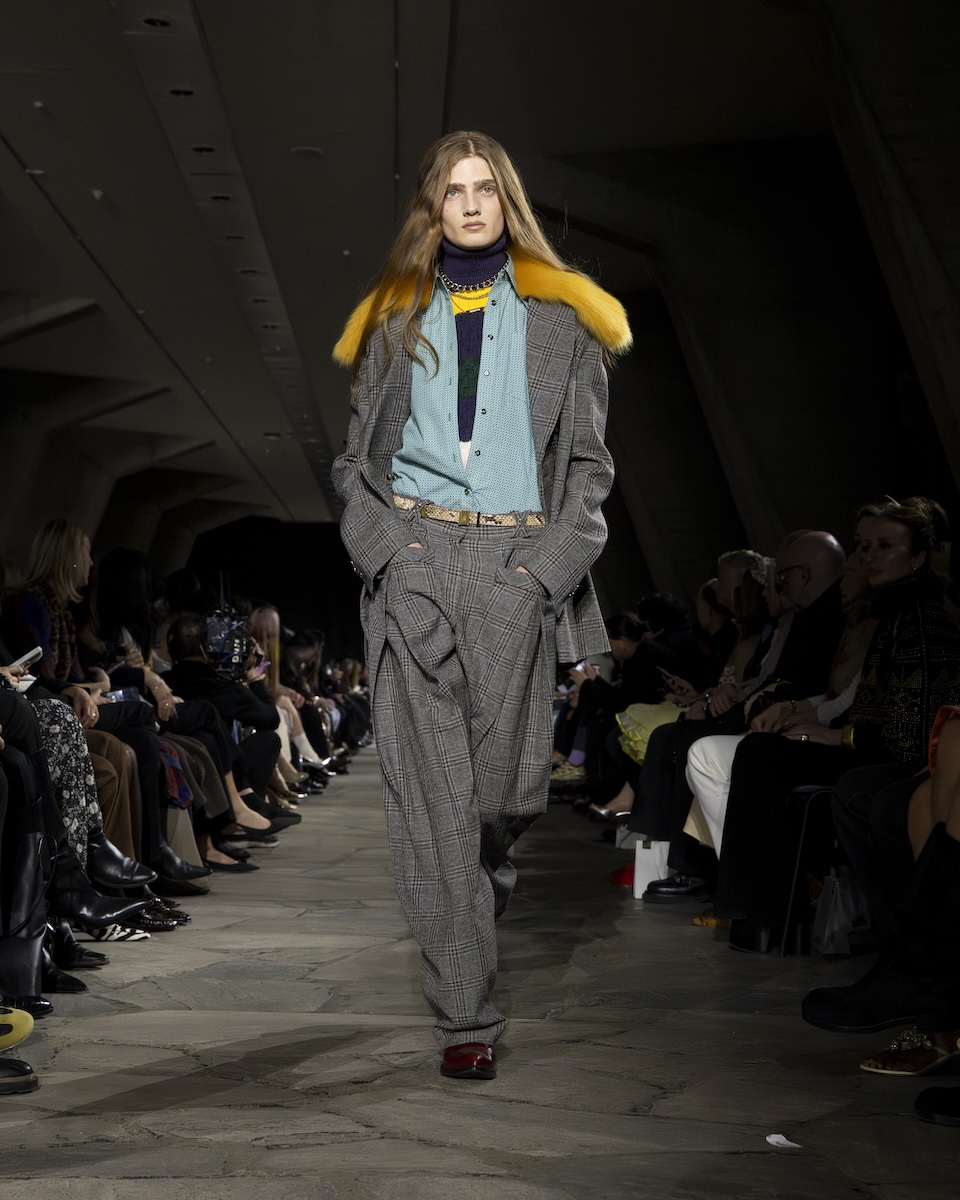 今季のベースは、貴族的な装いにヒントを得たクラシックで優雅なスタイル。テーラードスーツやボックスプリーツのフレアスカート、コンパクトなケーブルニット、ドレープやプリーツを生かした柔らかなドレス、シルクスカーフといったアイテム、そして伝統的なチェックやレオパード、アンティークなフローラルといった柄使いがカギになりました。ただ、スーツをピタピタのフィット感で仕上げたり、チェックジャケットを襟の付け根に入れたスリットに頭と通して着られるようにアレンジしたり、スカーフをスカートやスーパーロング丈に作り変えたり、カラフルなバイカージャケットやセカンドスキンニットを差し込んだり。「アクネ」らしい捻りを効いかせたデザインとスタイルで現代的に再解釈しているのが特徴です。