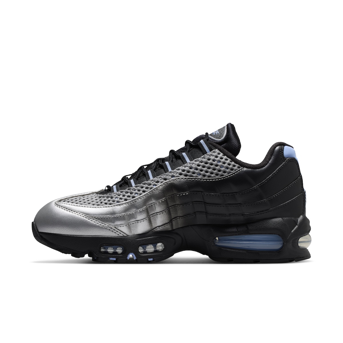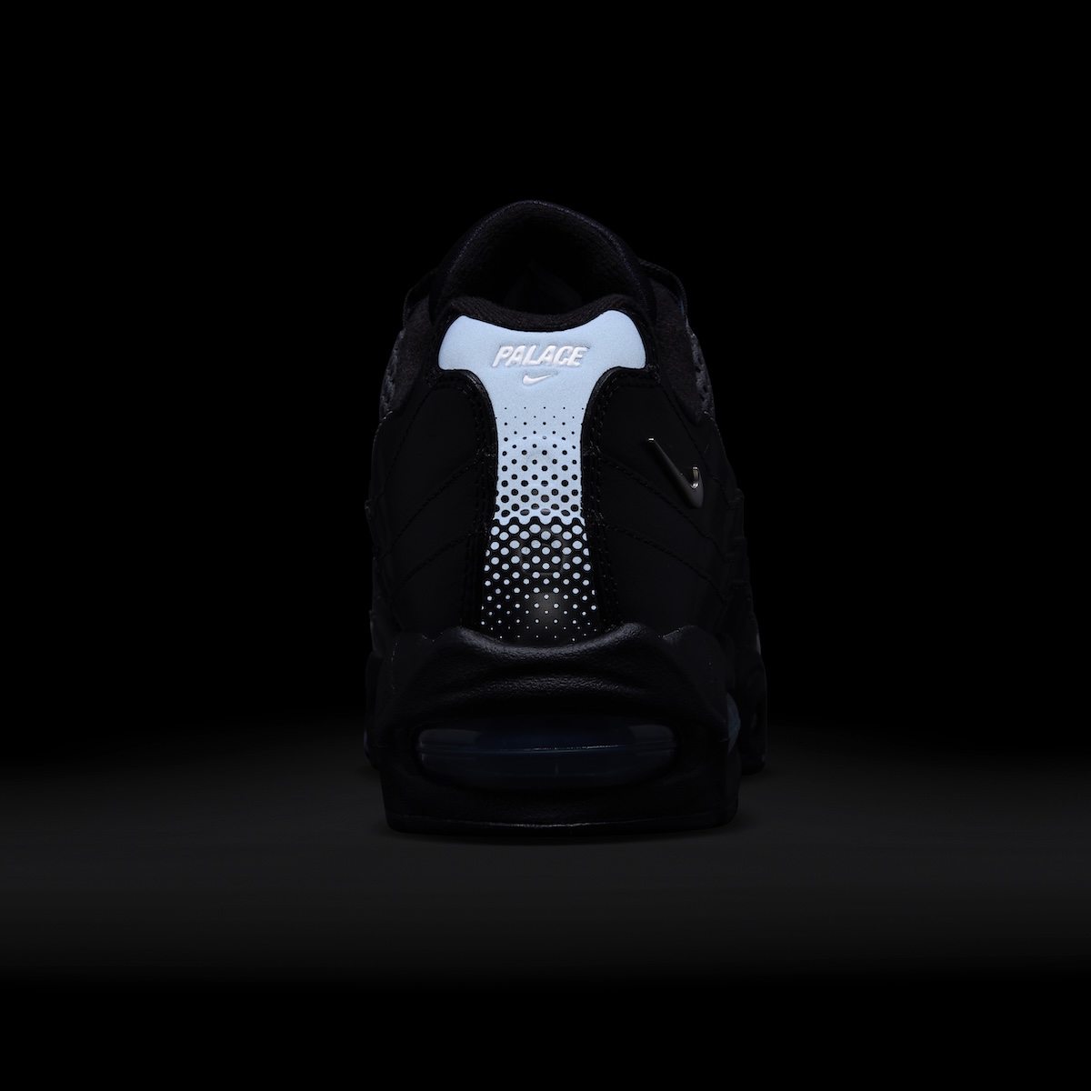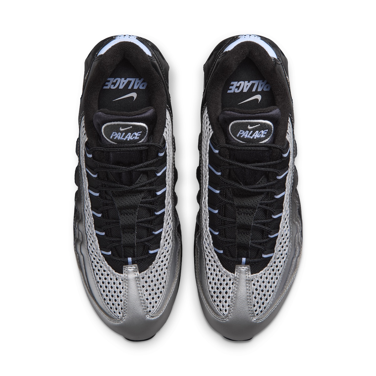 “パレス ナイキ エア マックス95 ”(Palace Nike Air Max 95)は前から後ろにかけてシルバーからブラックへと移り変わるスプレーグラデーションを採用した。メタリックなシルバー仕上げは“エア マックス 97 シルバー ブレット”(Air Max 97 Silver Bullet)へのオマージュだ。