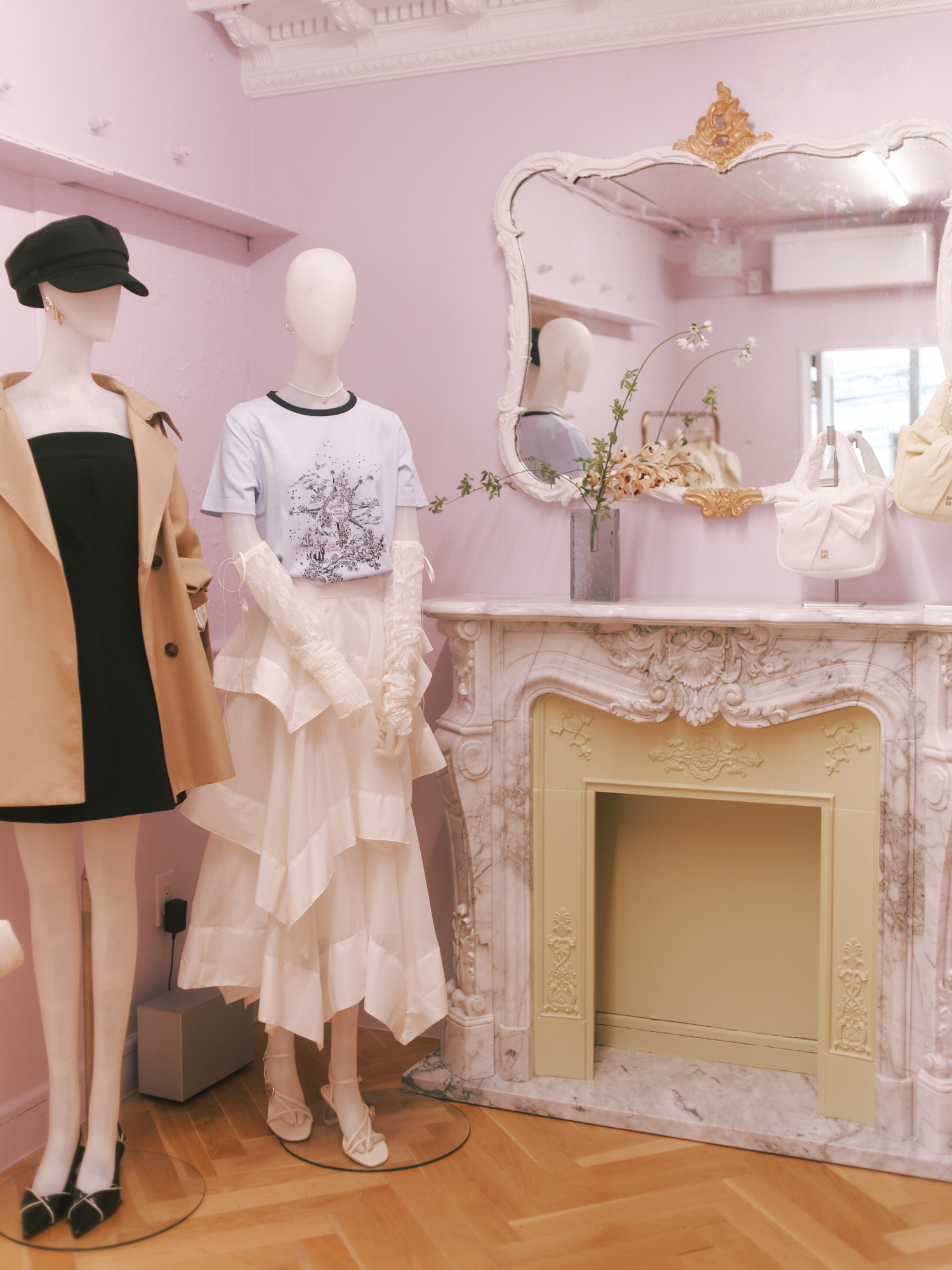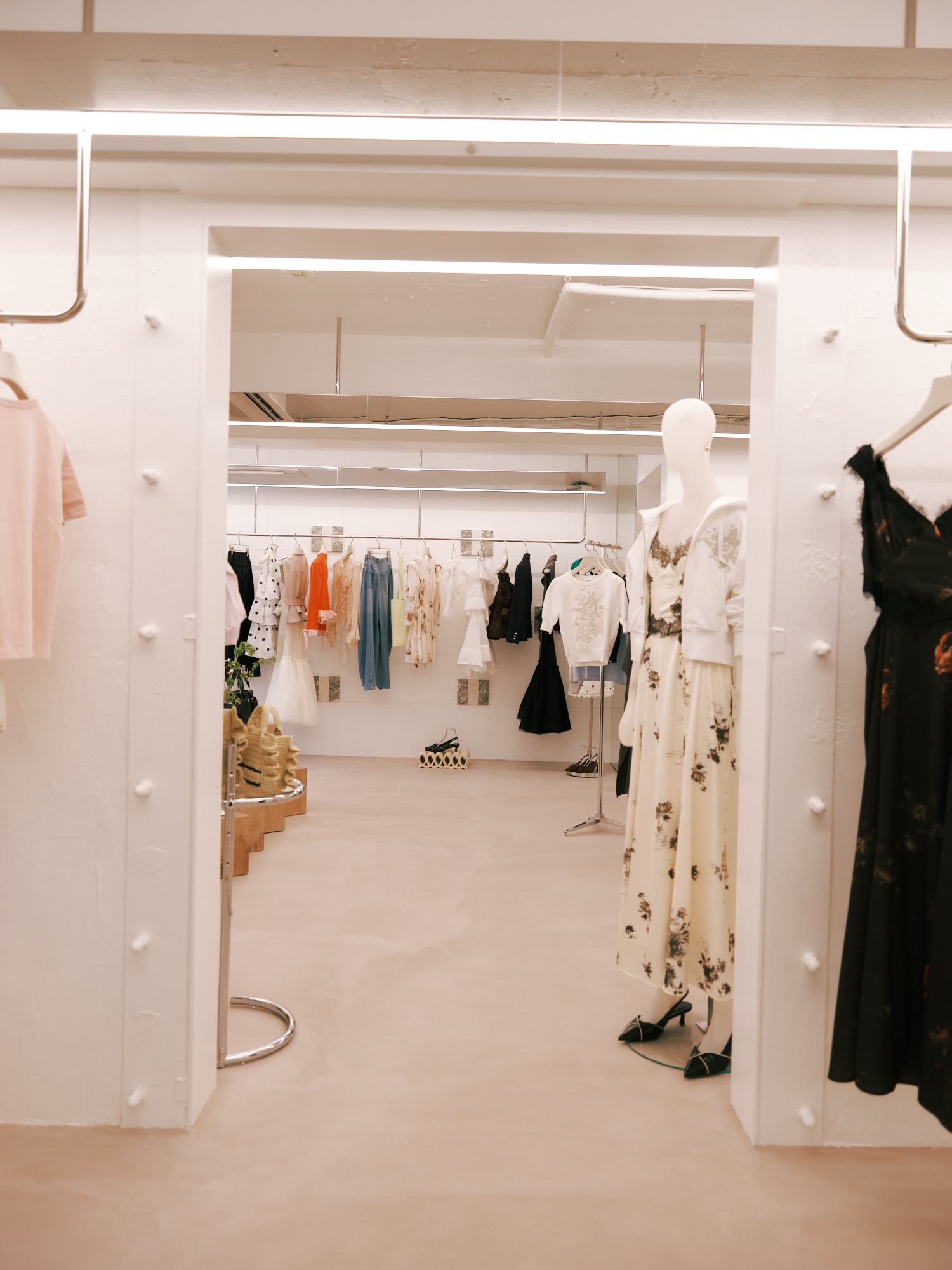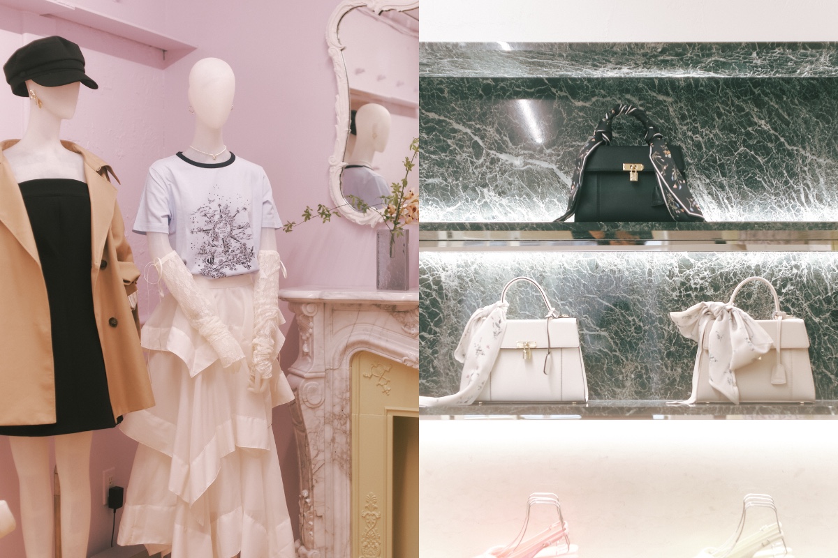1階はピンクと白を基調に、フェミニンな魅力が凝縮。花柄のワンピースや繊細なレースのトップス、ポルカドットとラッフルを組み合わせたスカートなど、ブランドを象徴するフェミニンなアイテムを集積した。大理石調のパネルや陶器のオブジェ、オニキス調の大理石を用いたカーブ型カウンター金装飾の縦長ミラーなどが、まるで高級ホテルのようなムードを演出する。