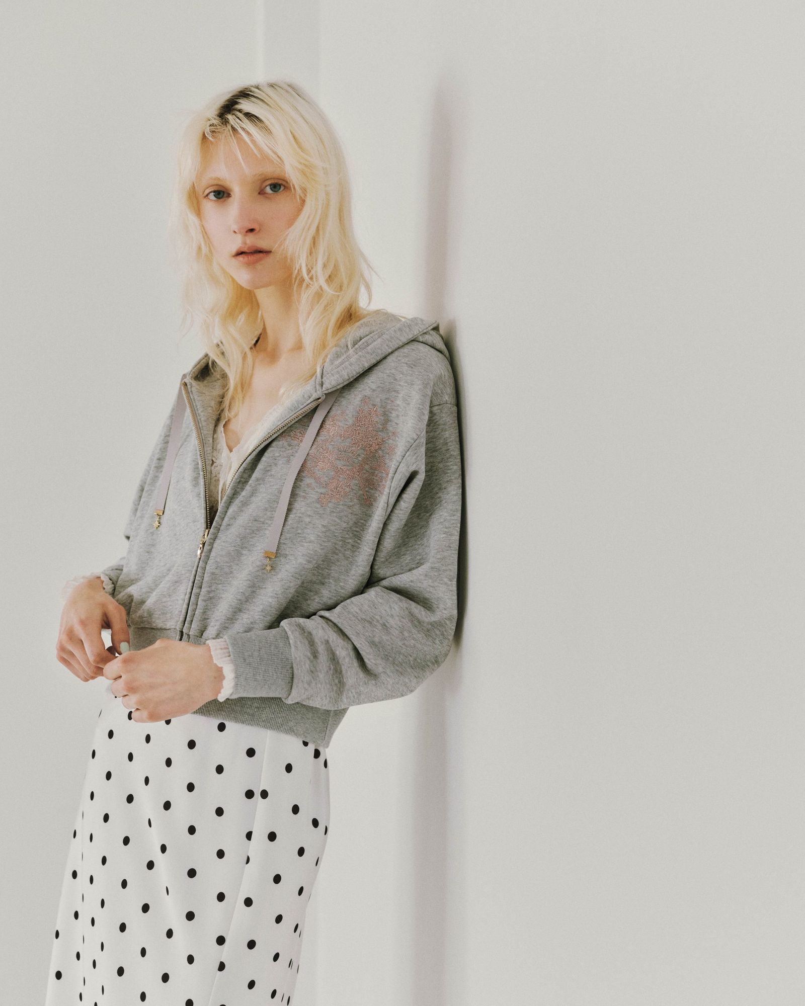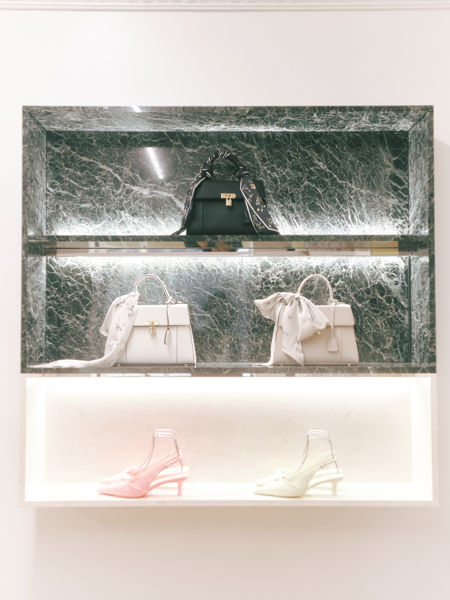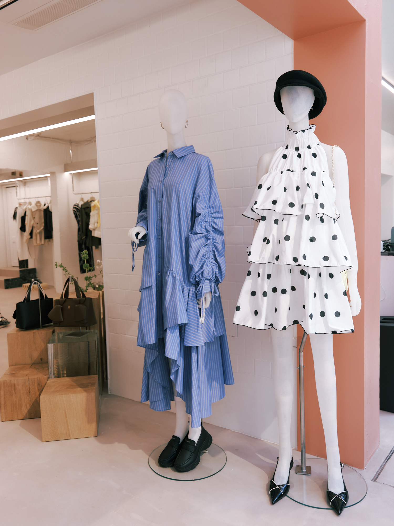 1階はピンクと白を基調に、フェミニンな魅力が凝縮。花柄のワンピースや繊細なレースのトップス、ポルカドットとラッフルを組み合わせたスカートなど、ブランドを象徴するフェミニンなアイテムを集積した。大理石調のパネルや陶器のオブジェ、オニキス調の大理石を用いたカーブ型カウンター金装飾の縦長ミラーなどが、まるで高級ホテルのようなムードを演出する。