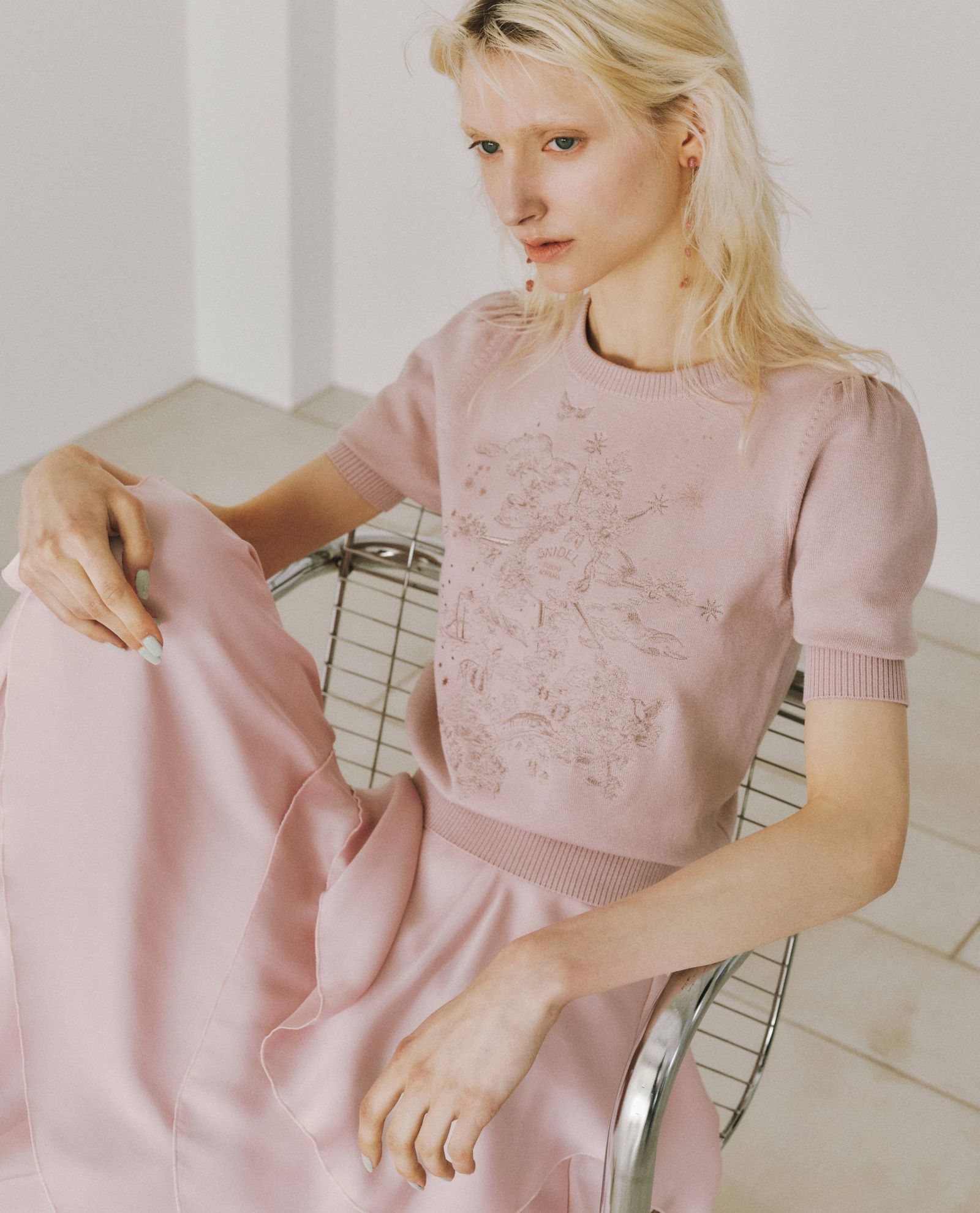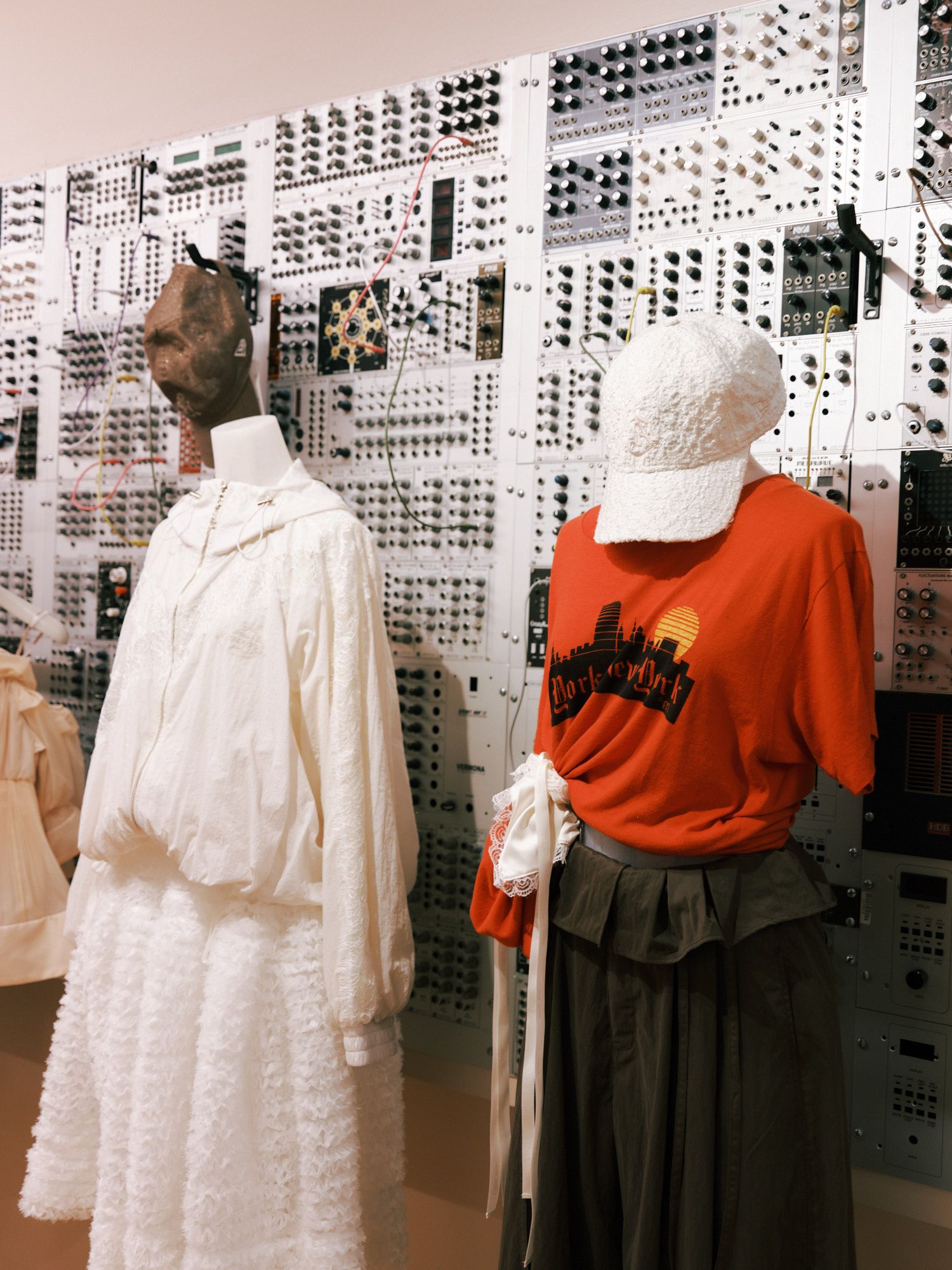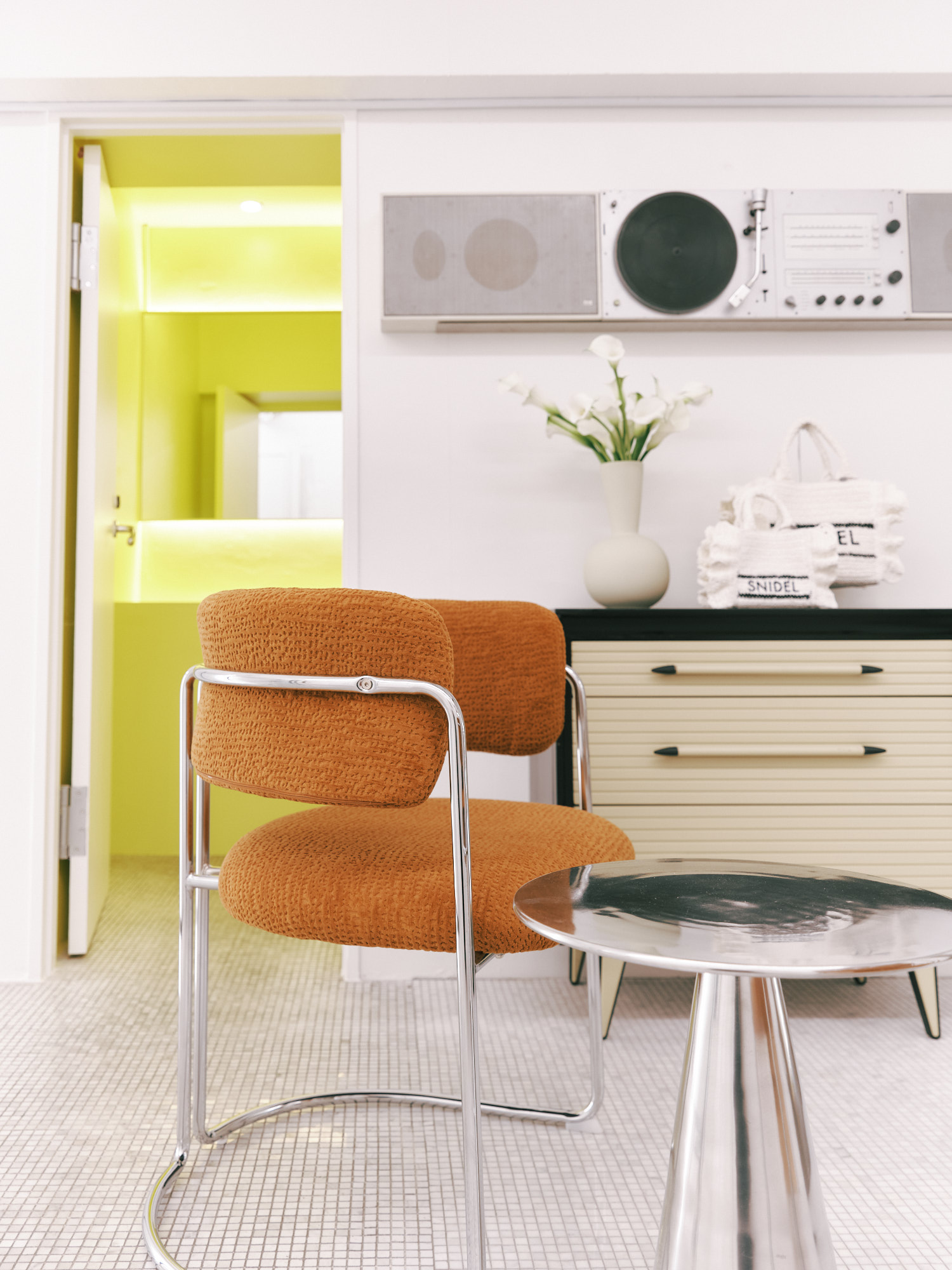 2階は一転してエッジィな表情を見せる。白で統一された縦長の空間には両サイドに長いハンギングラックが配され、「チャコット(CHACOTT)」とのコラボアイテムなどモード感のある品ぞろえに加え、トルソーコーデもフリルケープ風アウター、オレンジのグラフィックTシャツ、カーキのプリーツスカートを合わせるなどテイストミックスで遊びを効かせる。インテリアも、バウハウスを想起させるクロームパイプとテキスタイルのチェアや、ディーター・ラムスがデザインした「ブラウン(Braun)」のアナログレコードプレーヤーを飾るなど、洗練と先鋭のムードが漂う。