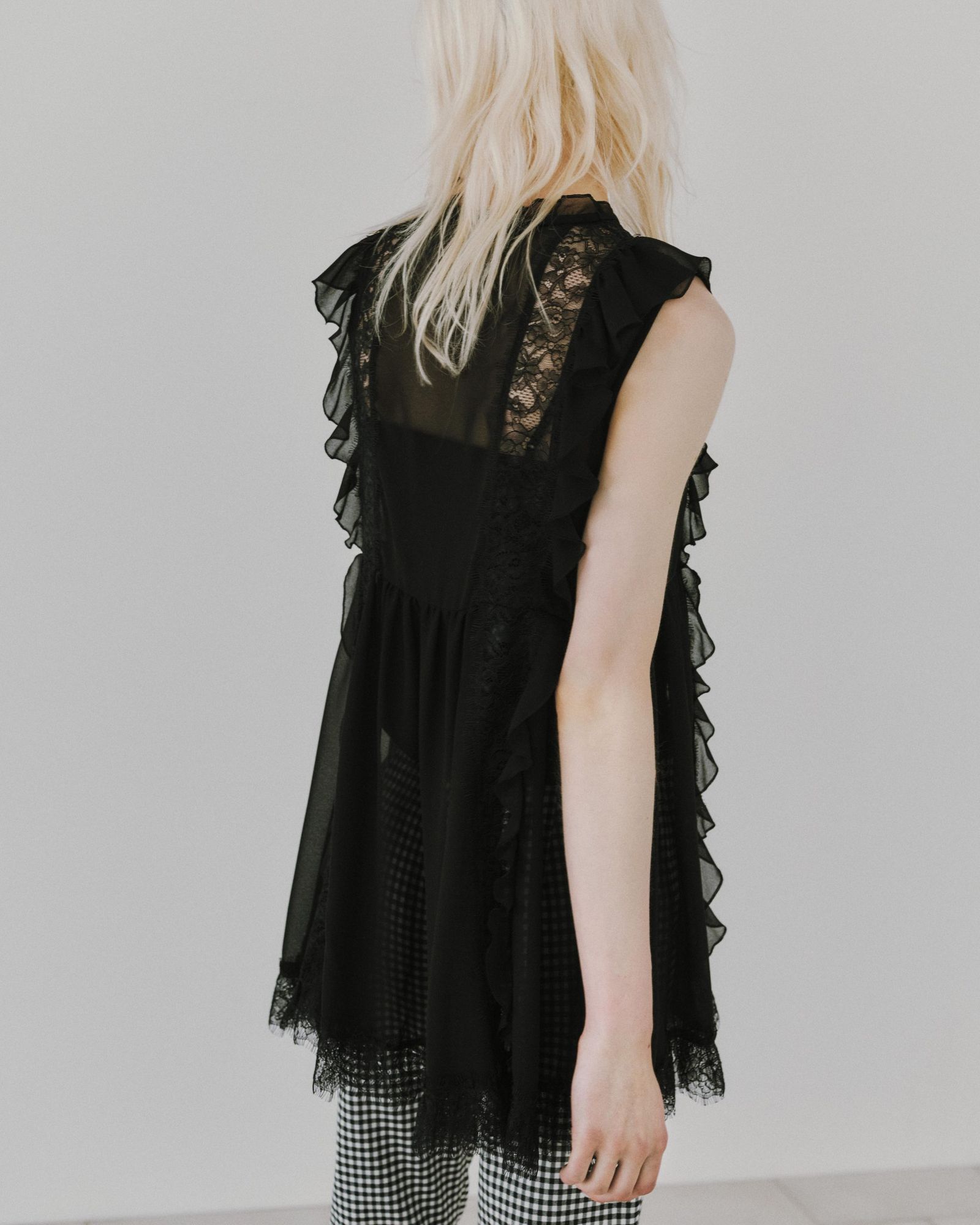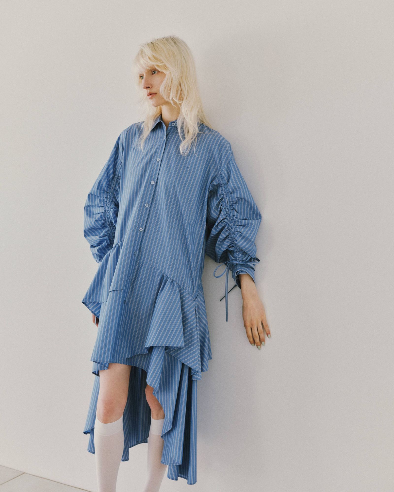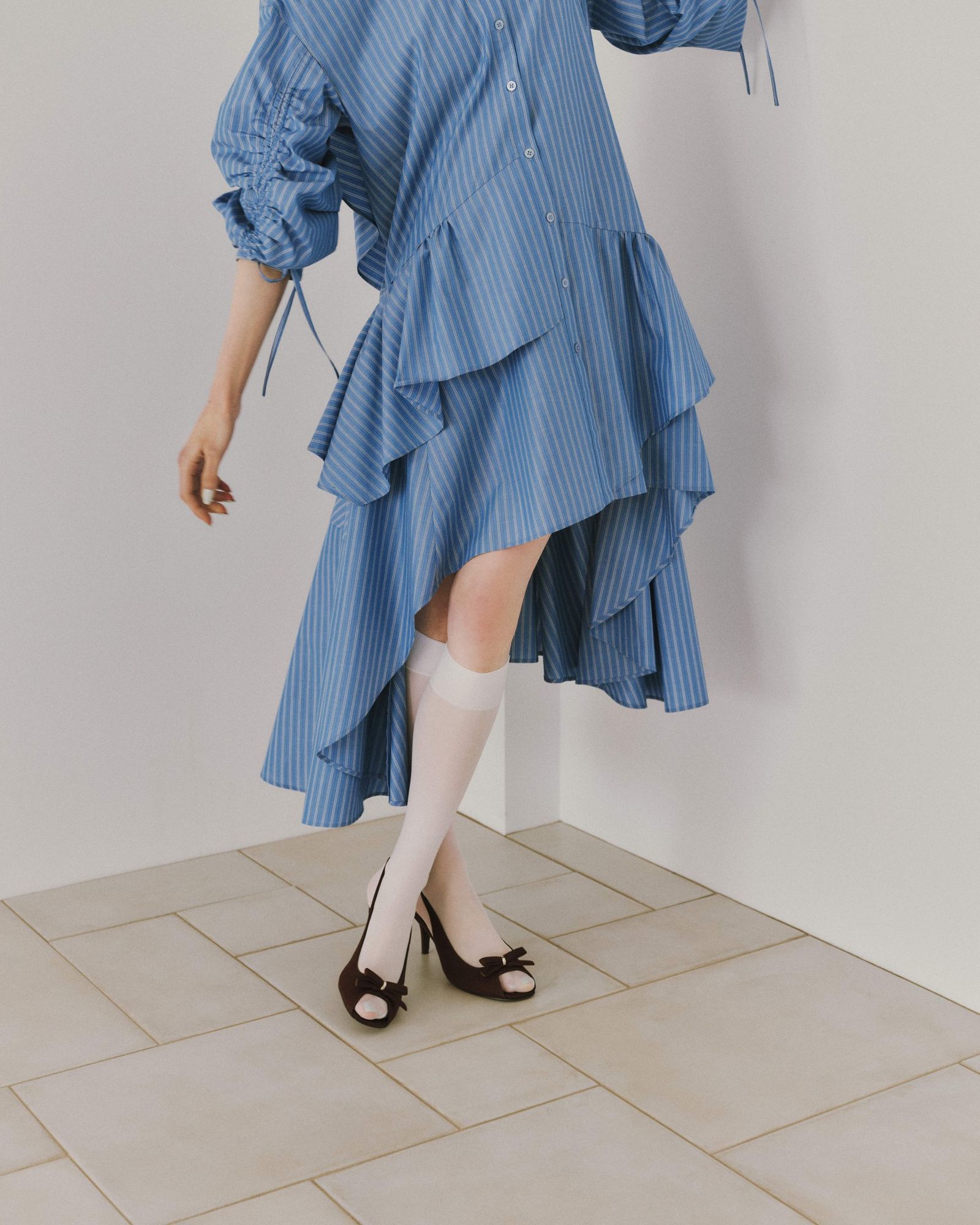 2階は一転してエッジィな表情を見せる。白で統一された縦長の空間には両サイドに長いハンギングラックが配され、「チャコット(CHACOTT)」とのコラボアイテムなどモード感のある品ぞろえに加え、トルソーコーデもフリルケープ風アウター、オレンジのグラフィックTシャツ、カーキのプリーツスカートを合わせるなどテイストミックスで遊びを効かせる。インテリアも、バウハウスを想起させるクロームパイプとテキスタイルのチェアや、ディーター・ラムスがデザインした「ブラウン(Braun)」のアナログレコードプレーヤーを飾るなど、洗練と先鋭のムードが漂う。