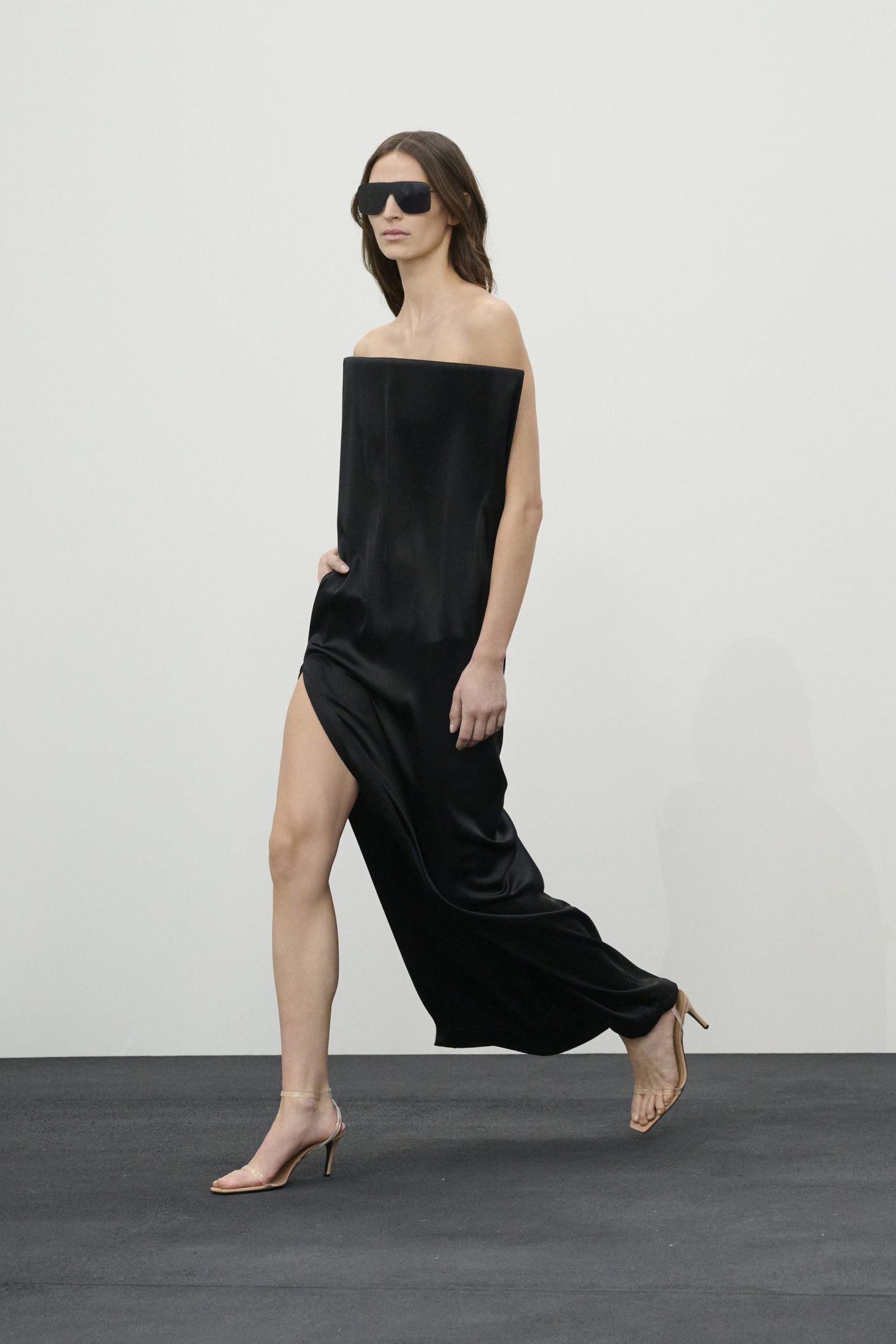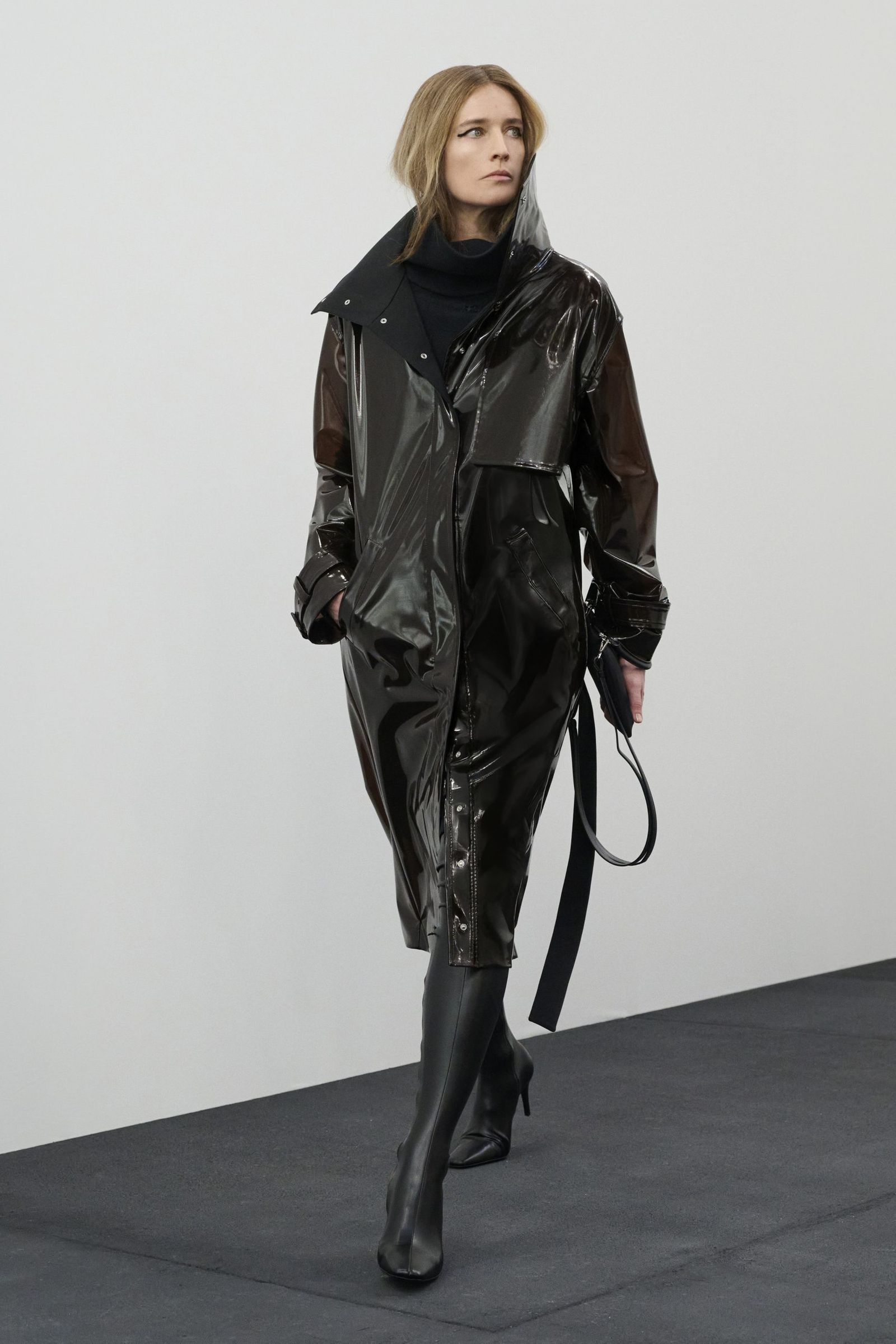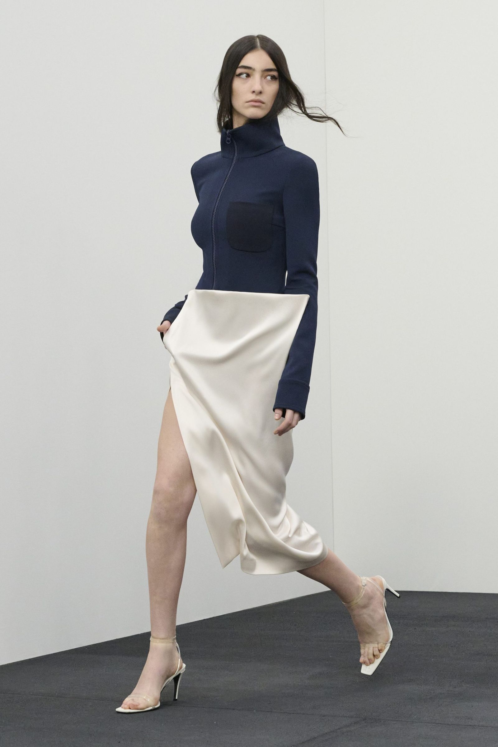 そんなアナログ時計の針が刻む音から始まったショーのファーストルックは、寝起きにシーツを身にまとったような白のサテンドレス。そして、1日の移り変わりを表すように変わる環境音とともにショーは進んでいきます。例えば、窓を開けたり、コーヒーを淹れたりしてから、家を出て、メトロに乗って……といったように。それに合わせて登場するルックも、高いスタンドカラーのコートやブルゾン、ミニドレスやスカート、シャツ、タートルネックニット、デニムといった都会にふさわしいデイウエアになり、終盤にはイブニングスタイルへと変化。ラストは1日の終わりにベッドへと戻っていくかのように、シーツ風のブラックドレスで締めくくりました。