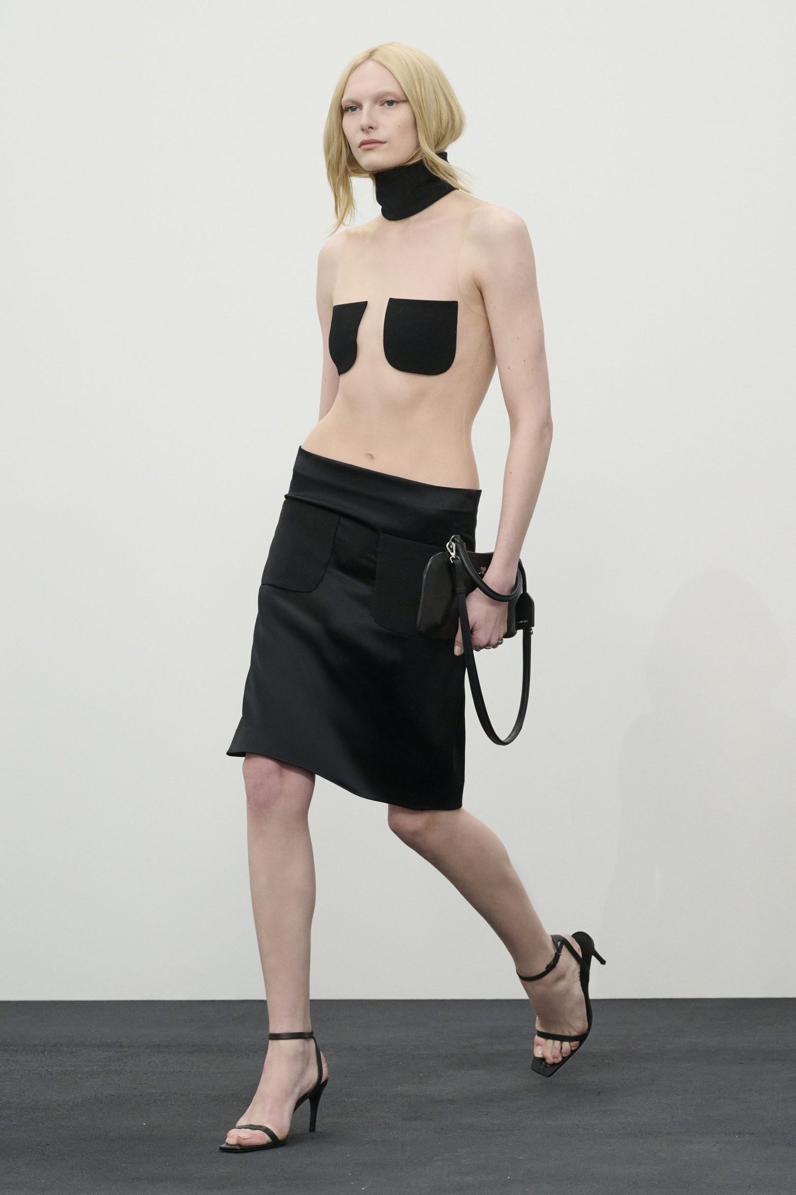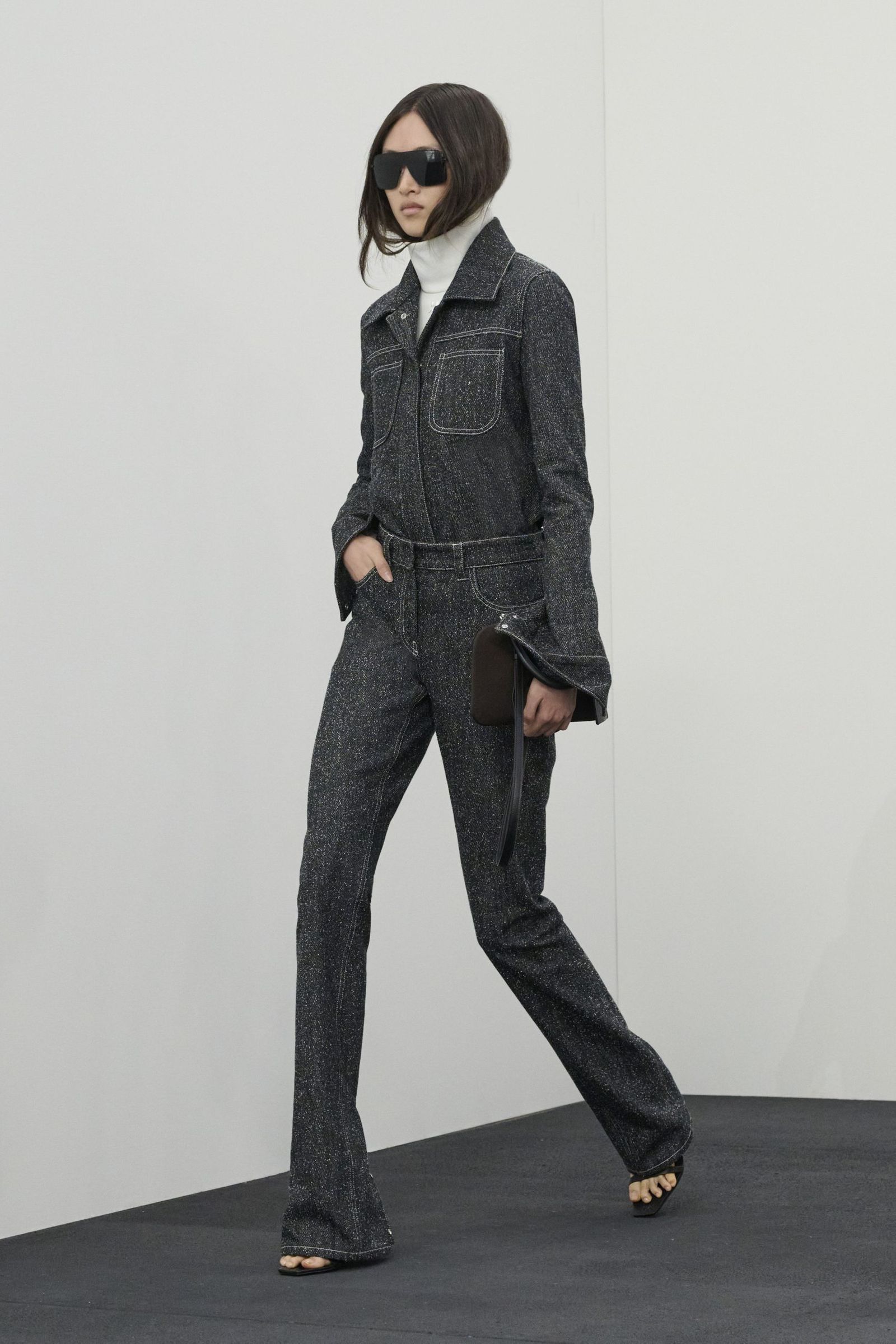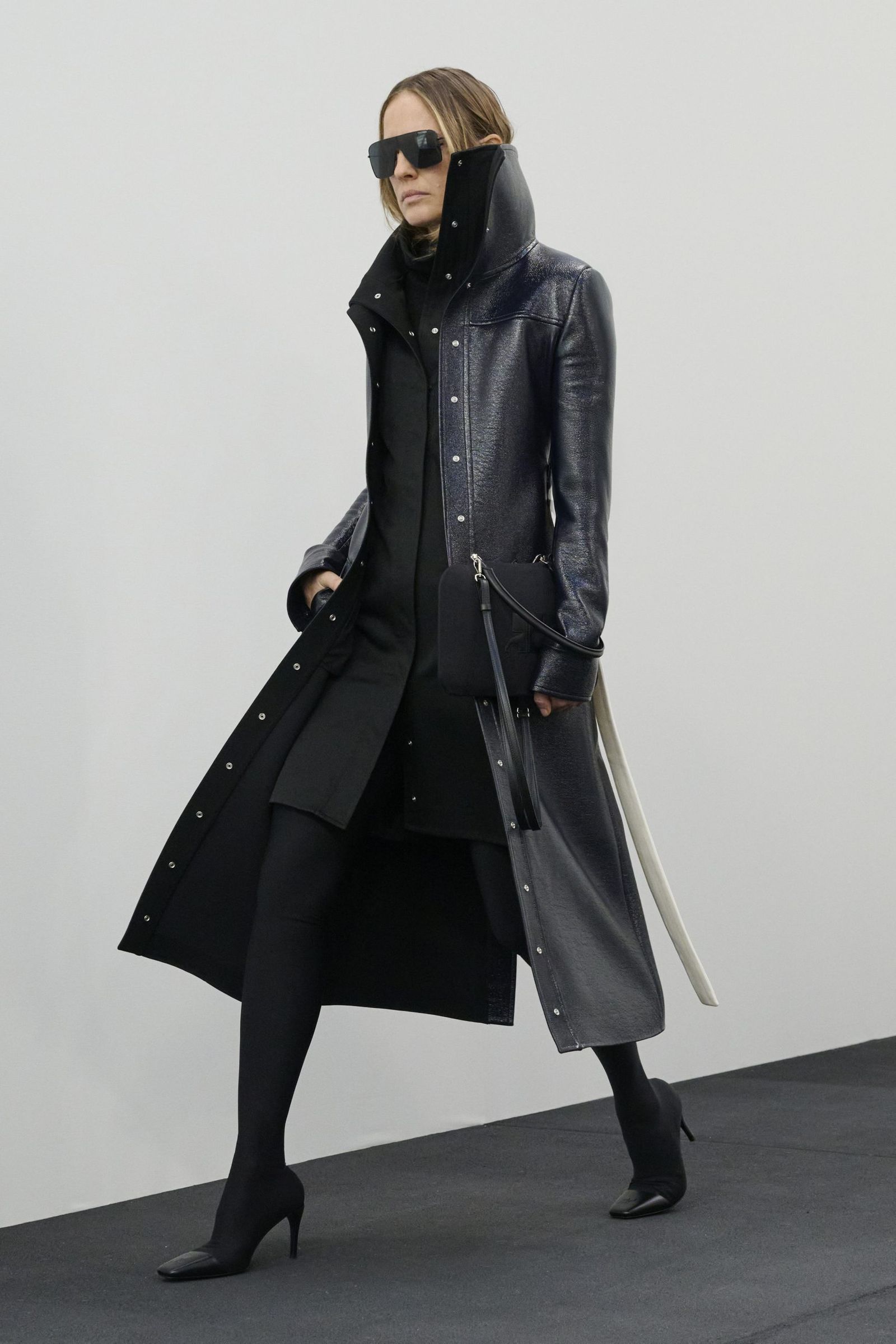 そんなアナログ時計の針が刻む音から始まったショーのファーストルックは、寝起きにシーツを身にまとったような白のサテンドレス。そして、1日の移り変わりを表すように変わる環境音とともにショーは進んでいきます。例えば、窓を開けたり、コーヒーを淹れたりしてから、家を出て、メトロに乗って……といったように。それに合わせて登場するルックも、高いスタンドカラーのコートやブルゾン、ミニドレスやスカート、シャツ、タートルネックニット、デニムといった都会にふさわしいデイウエアになり、終盤にはイブニングスタイルへと変化。ラストは1日の終わりにベッドへと戻っていくかのように、シーツ風のブラックドレスで締めくくりました。