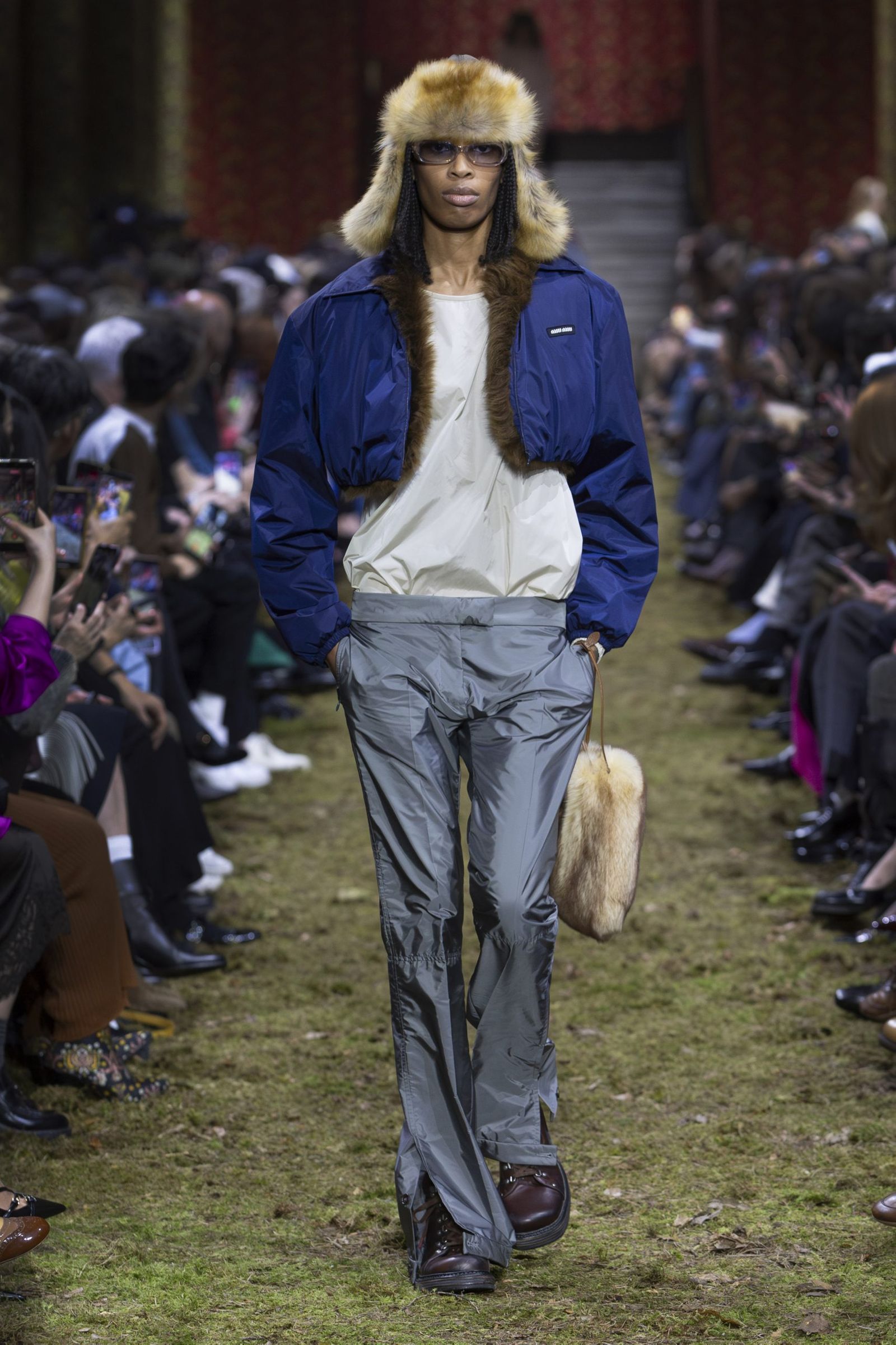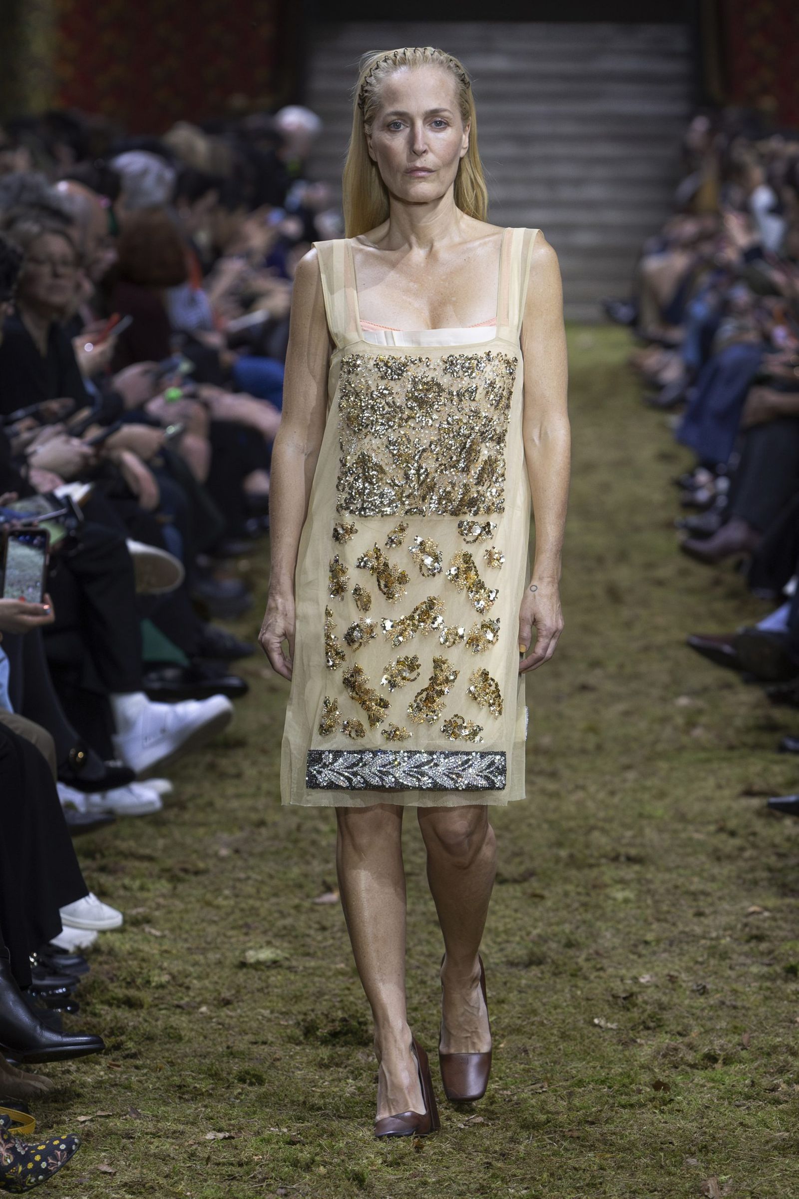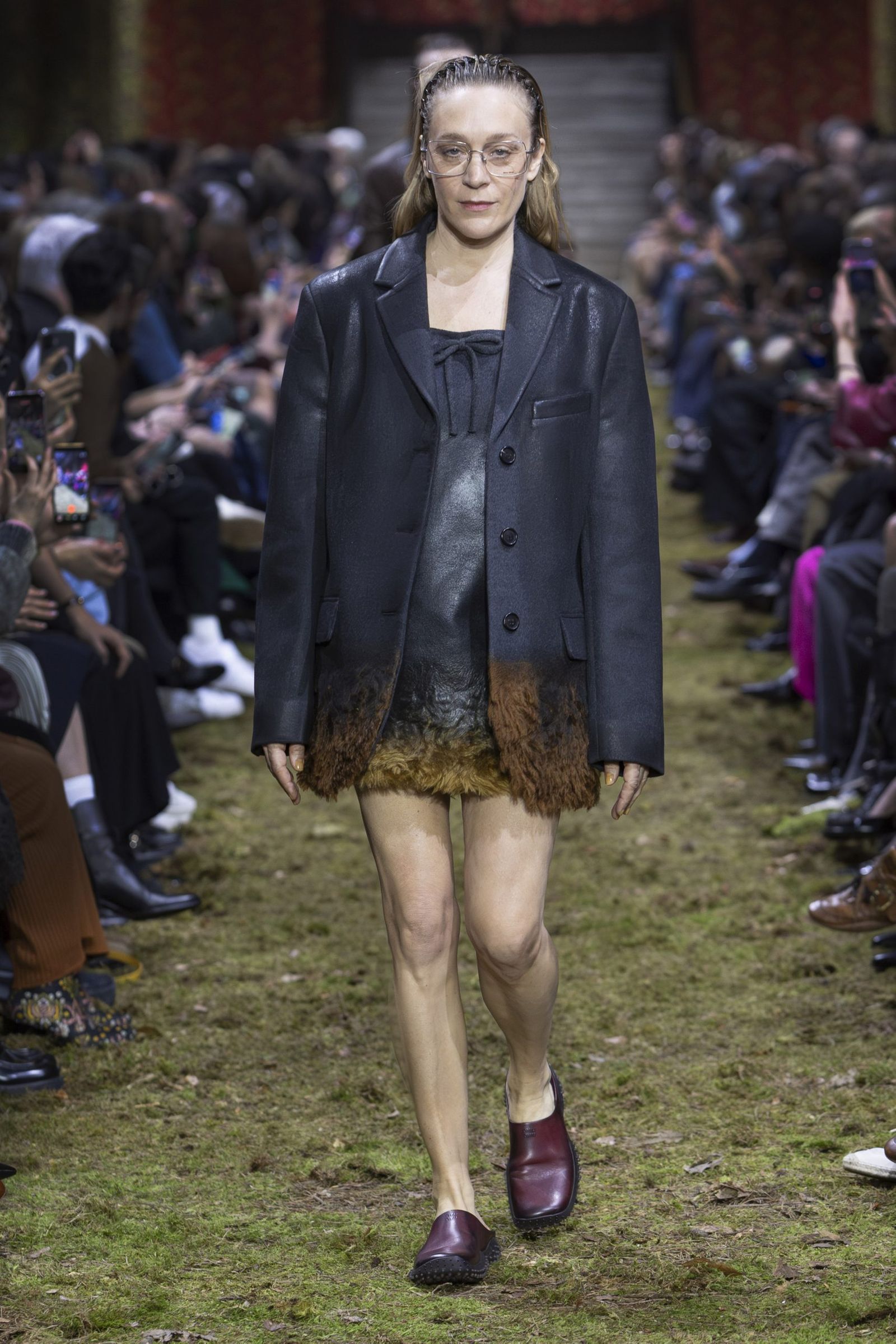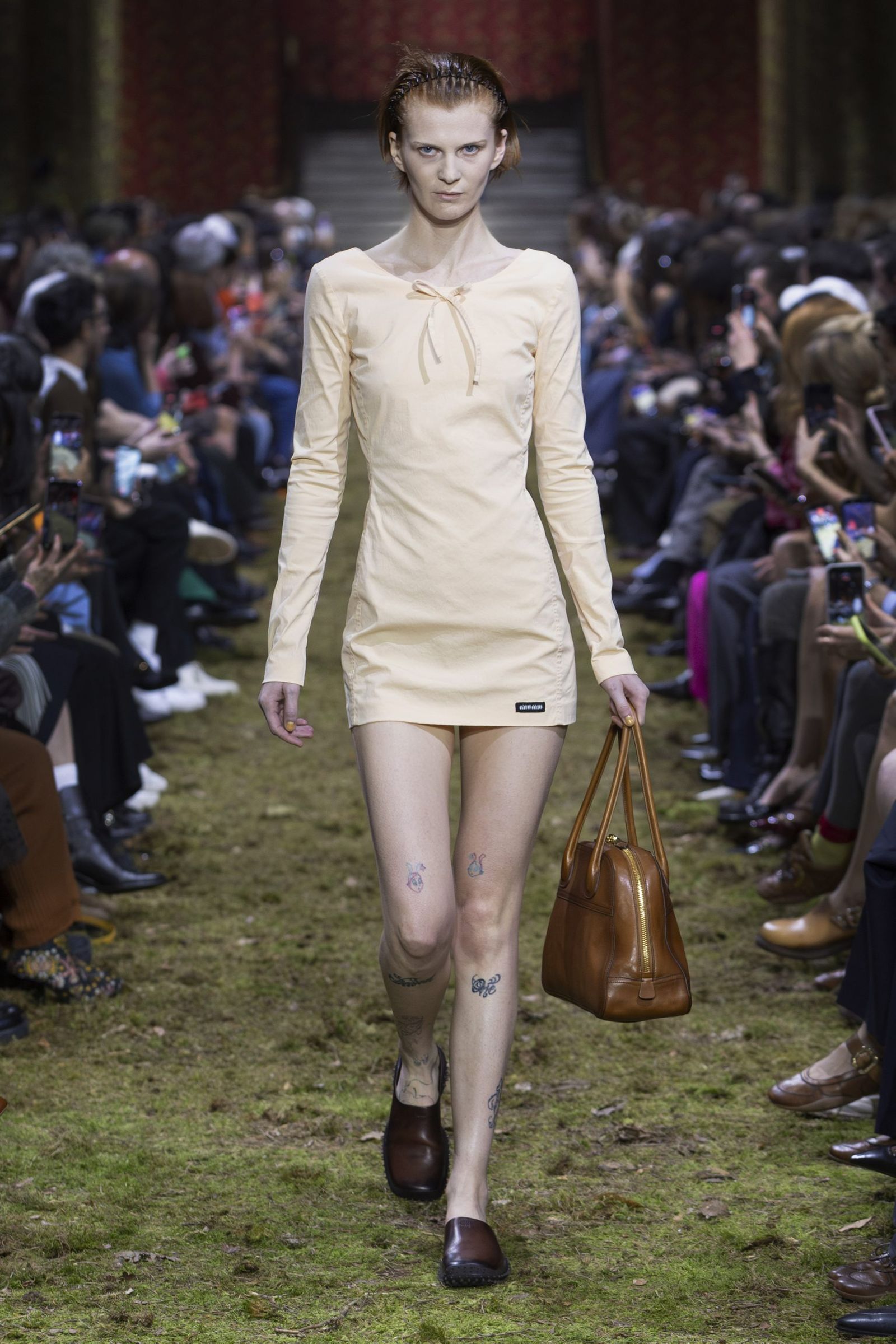 また、毎回「ミュウミュウ」のショーはキャスティングもユニークですが、今季も多様な顔ぶれが目を引きました。イエナ宮の格式ある空間に土や草、小枝を敷き “野生の森”を再現したランウエイに登場したのは、ジリアン・アンダーソン(Gillian Anderson)やクロエ・セヴィニー(Chloe Sevigny)、ジェマ・ワード(Gemma Ward)から、映画監督リュック・ベッソン(Luc Besson)の娘サティーン・ベッソン(Sateen Besson)、クンバ・サンバ(Coumba Samba)、ドンキー・キッド(Donkey Kid)、トゥモロー・バイ・トゥギャザー(TOMORROW X TOGETHER)のチェ・ヨンジュン(Choi Yeonjun)まで、幅広い年齢の俳優やアーティスト、ミュージシャン、モデルたち。今季のミニマルなスタイルは、それぞれの内面から滲み出す個性やエネルギーを際立たせました。