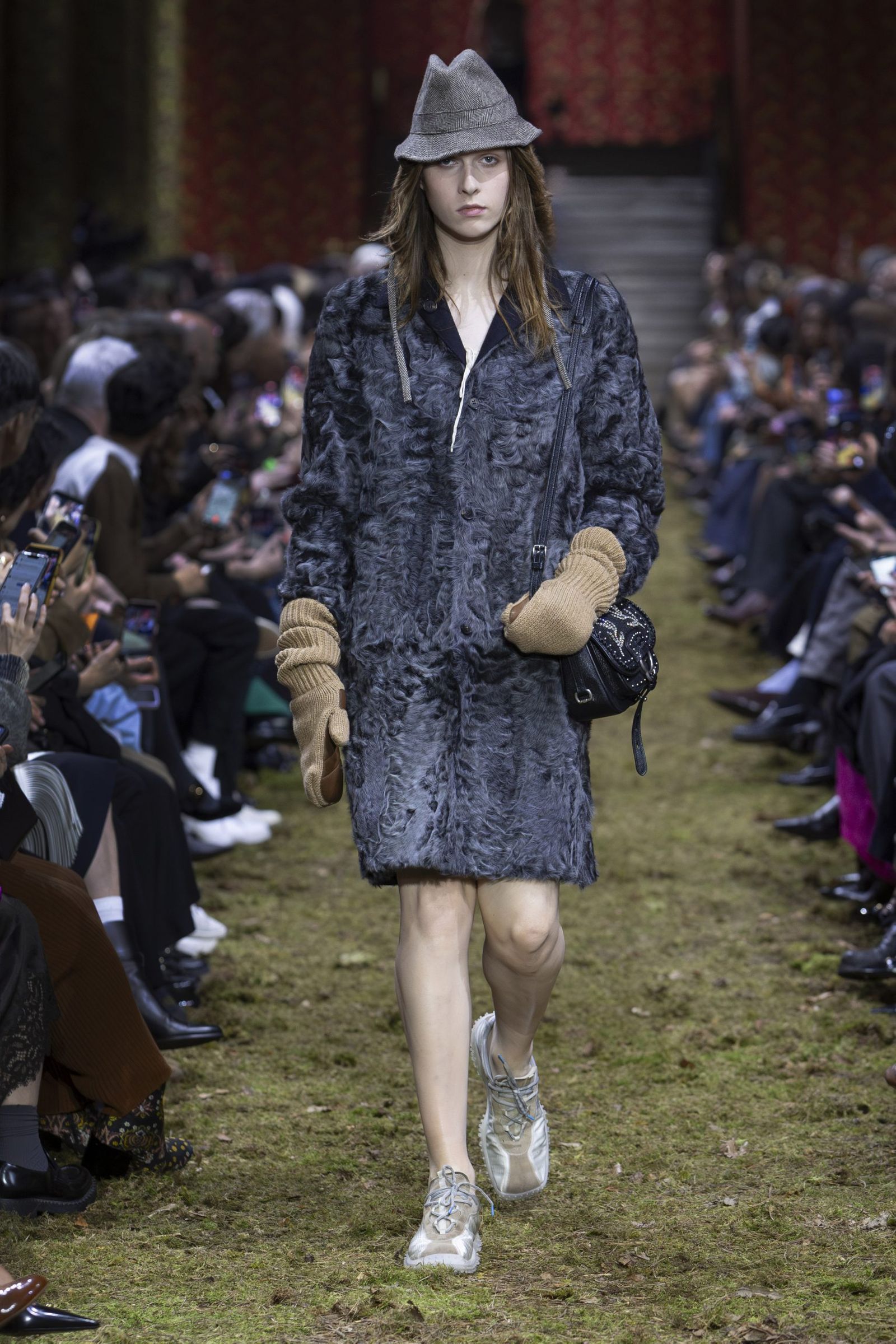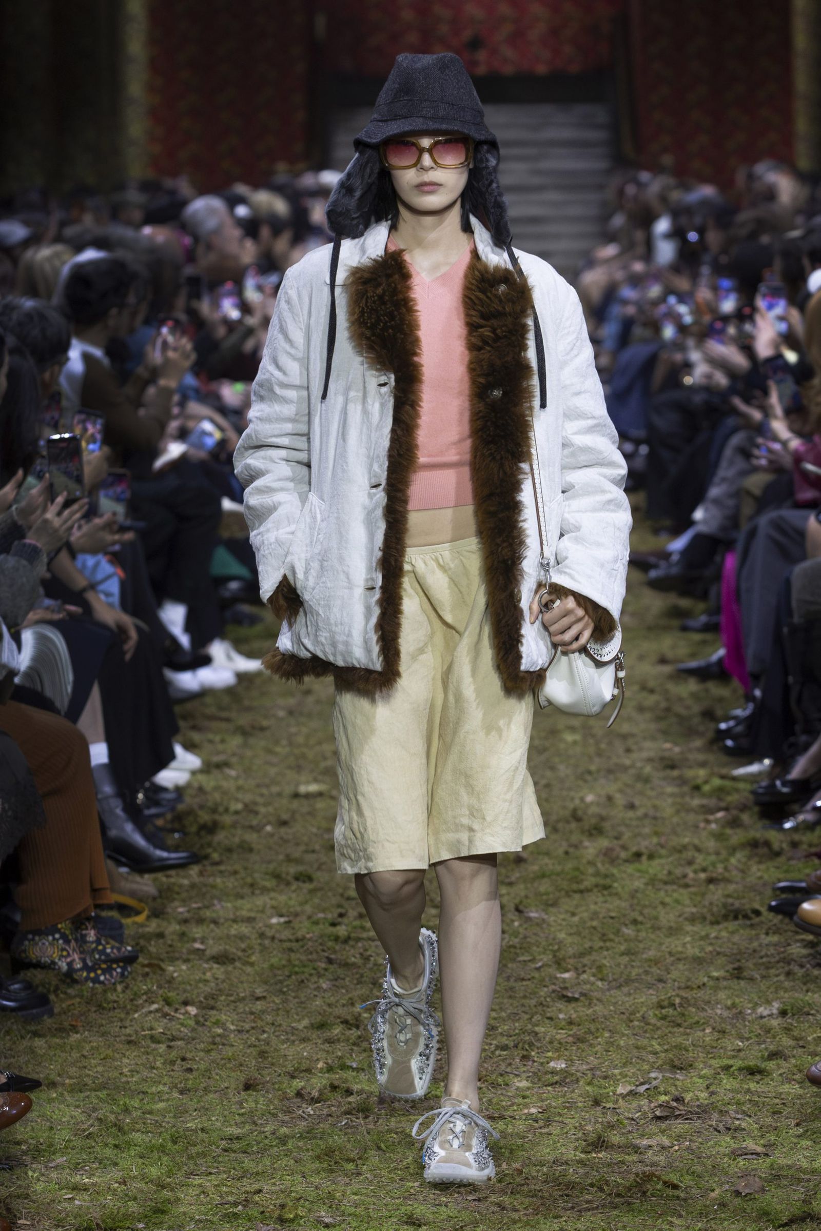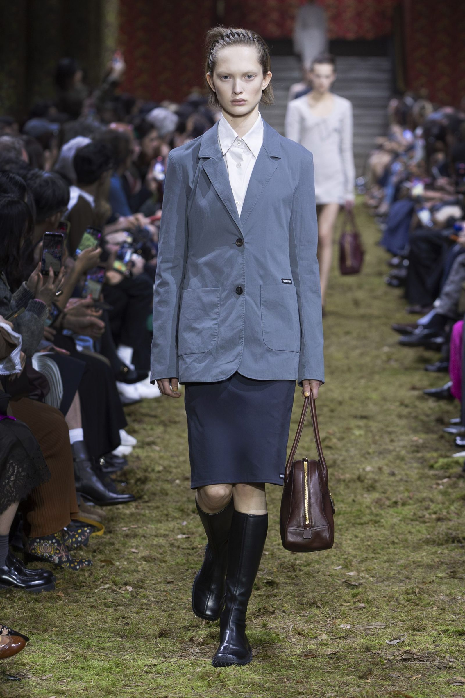 また、毎回「ミュウミュウ」のショーはキャスティングもユニークですが、今季も多様な顔ぶれが目を引きました。イエナ宮の格式ある空間に土や草、小枝を敷き “野生の森”を再現したランウエイに登場したのは、ジリアン・アンダーソン(Gillian Anderson)やクロエ・セヴィニー(Chloe Sevigny)、ジェマ・ワード(Gemma Ward)から、映画監督リュック・ベッソン(Luc Besson)の娘サティーン・ベッソン(Sateen Besson)、クンバ・サンバ(Coumba Samba)、ドンキー・キッド(Donkey Kid)、トゥモロー・バイ・トゥギャザー(TOMORROW X TOGETHER)のチェ・ヨンジュン(Choi Yeonjun)まで、幅広い年齢の俳優やアーティスト、ミュージシャン、モデルたち。今季のミニマルなスタイルは、それぞれの内面から滲み出す個性やエネルギーを際立たせました。