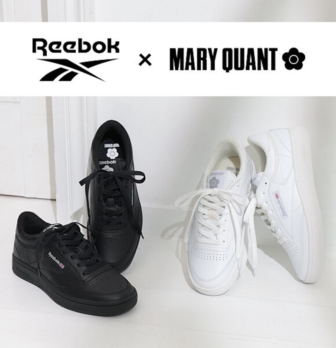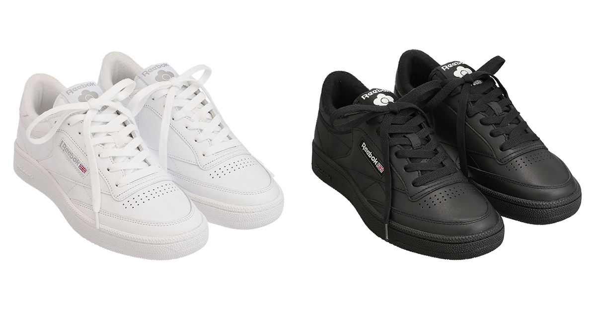 本アイテムは、1980年代の「リーボック」のクラシックなテニスシューズである“クラブ C 85 ビンテージ(CLUB C 85 VINTAGE)”をベースに「マリークワント」のアイコン“デイジー”をあしらい、シンプルな美しさを追求した。カラーはマルチに活躍するホワイトとブラックを用意し、コーディネートの幅を広げる。