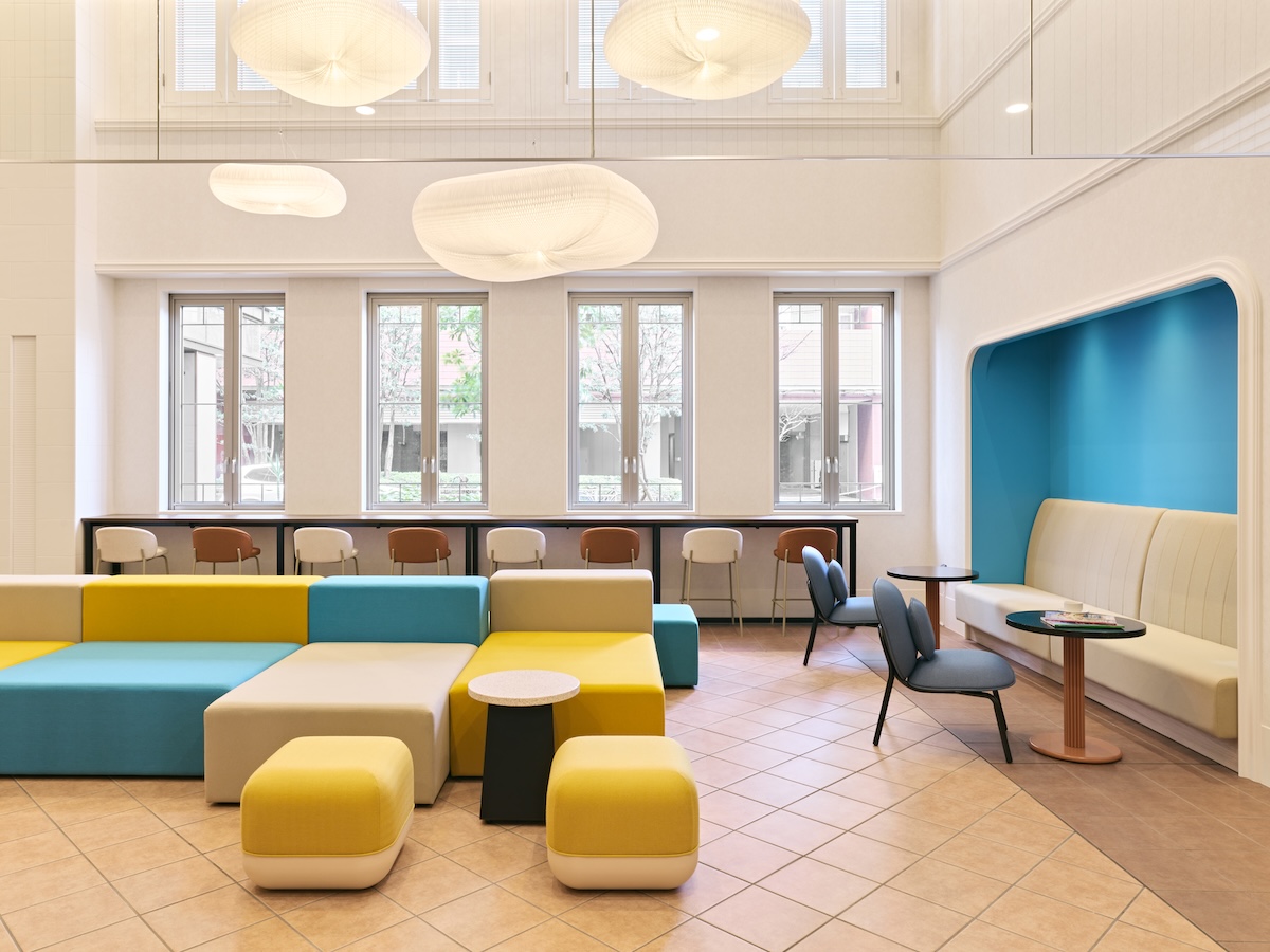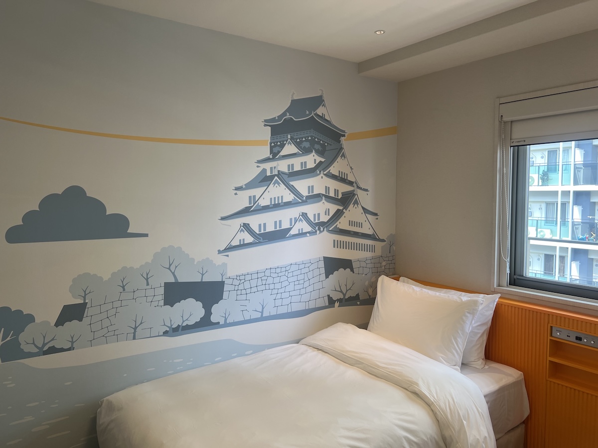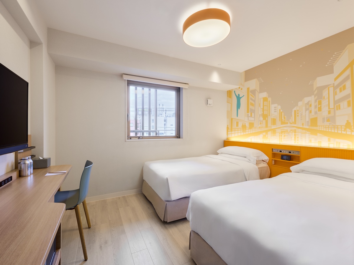 「センタラグランドホテル大阪」の高級路線に対し、「センタラライフなんばホテル大阪」は1泊1室1万円台のカジュアル路線のライフスタイルホテルブランドだ。スタンダード、スーペリア、デラックス、ファミリー、デラックスファミリールームなど12~36平方メートルの広さの5タイプの客室が全300室。イエローとブルーを基調にシンプルで洗練されたデザインと機能性を兼ね備えた空間に、大阪の名所をモチーフにした壁画が描かれる。シングルベッド2台とバンクベッド1台のデラックスファミリールームには、掘りごたつ式のリビングルームを備え、グループ滞在にも適している。