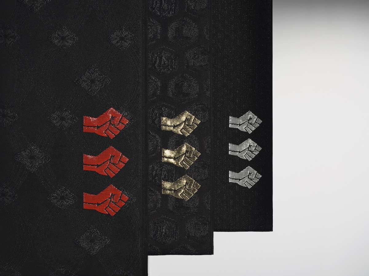 また、本展では黒人解放運動の歴史を着物の帯に織り込んだシリーズ作品を展示している。これらの帯には、60年代に暗殺されたマーティン・ルーサー・キング・ジュニア(Martin Luther King Jr.)、マルコムX(Malcolm X)、メドガー・エヴァーズ(Medgar Evers)ら黒人解放運動の指導者たちを追悼し、象徴的なフィストマーク(握りこぶし)と指導者たちの没年が織り込んだ。帯という日本の伝統的な装束の様式を、共同体の記憶と追悼の媒体として捉えた作品だという。