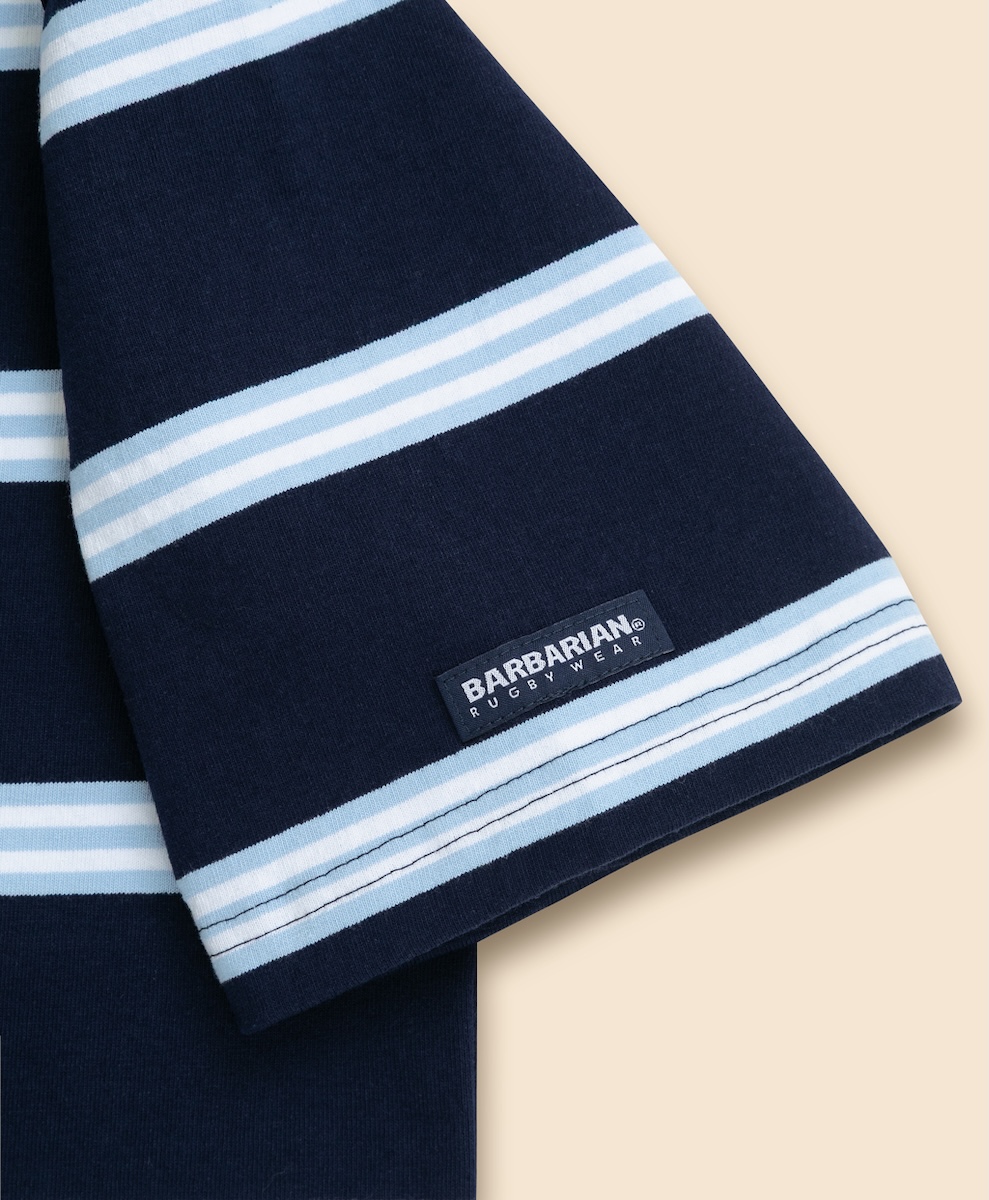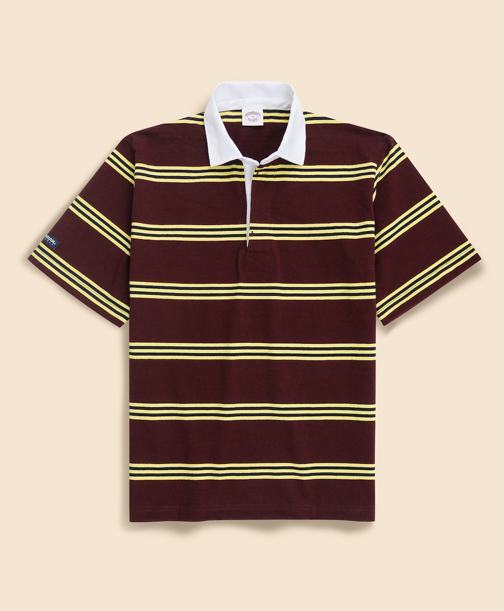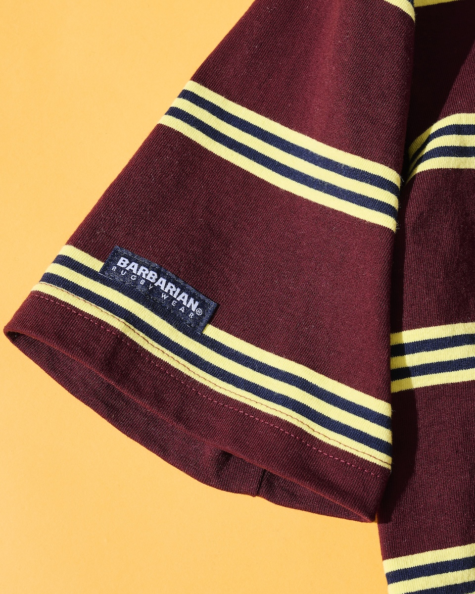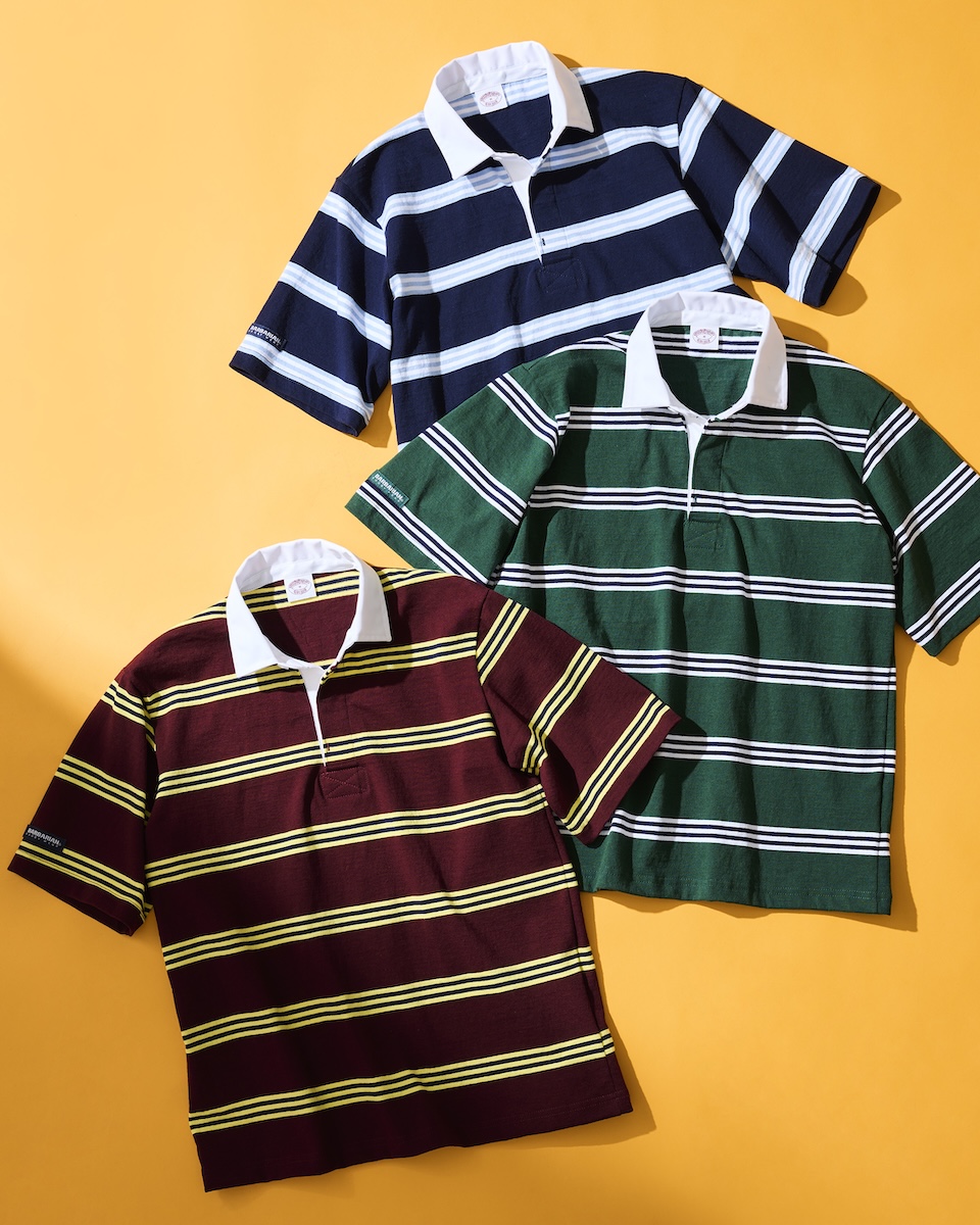 今回登場するラガーシャツは、半袖のラグビーシャツをベースに「ブルックス ブラザーズ」のシグネチャーストライプである“BB#1”(ナンバーワン)ストライプのパターンを採用した。首元には「ブルックス ブラザーズ」のメインラインの織りネーム、右袖には「バーバリアン」のブランドネームをあしらった。日本人の体型を考慮して作られた程よくゆとりのあるバランスの良いサイズ感で、素材はタウンユース向けに開発された8ozのライトウェイトコットンを100%使用したため、丈夫で長持ちするうえ洗うほどに風合いが増していくのも特徴だ。