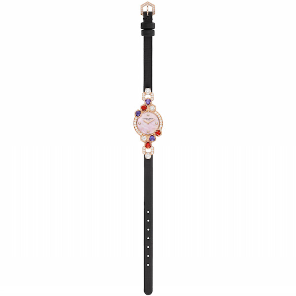 18Kピンクゴールド、ダイヤモンド、レッドスピネル、アメシスト、ピンクマザー・オブ・パールがあしらわれ、ブラックサテンストラップが印象的。