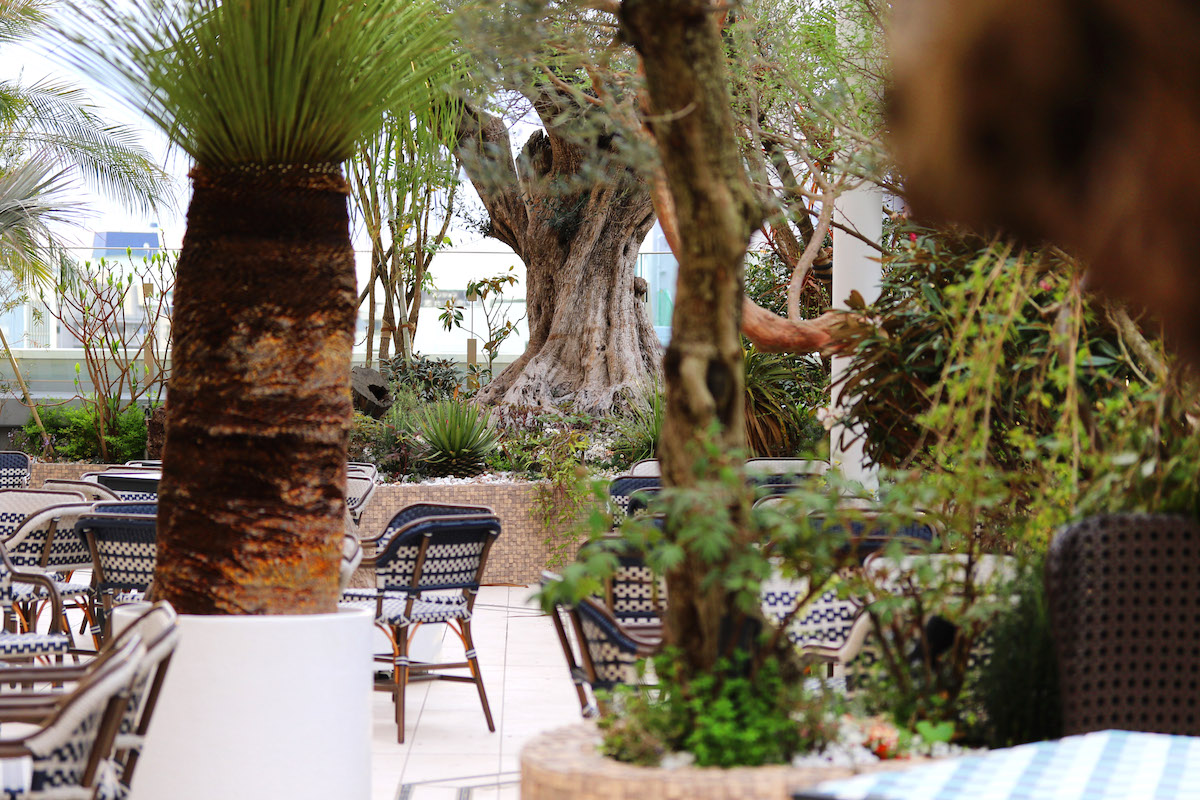 緑豊かな空間は、植栽集団「ソルソファーム(SOLSO FARM)」によるもの。中央に広がる芝生を取り囲むように120席を設置している。風が強い日は物が飛ばないように注意が必要!