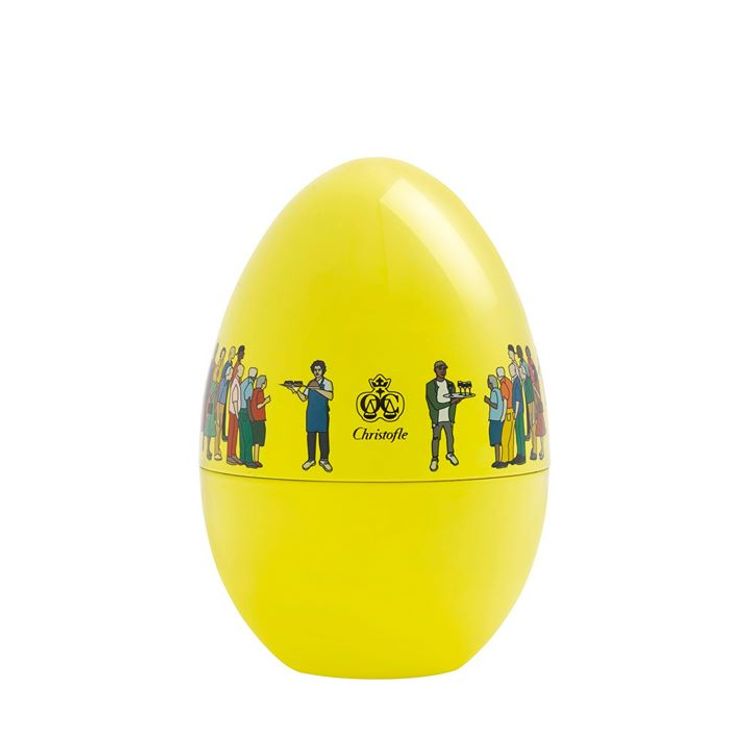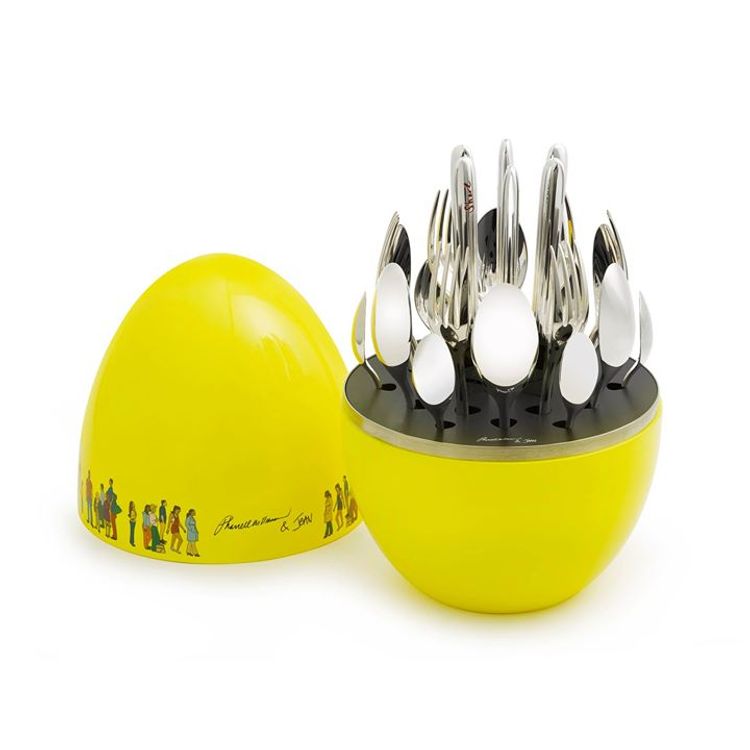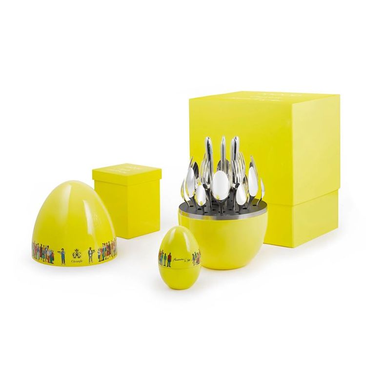 ウィリアムスは“シェア”を合言葉に、友人のフランス人シェフであるジャン・アルベール(Jean Albert)と共に“ムード”をデザイン。卵型のケースは喜びを象徴する鮮やかなイエローに彩られ、“友情”“創造”“分かち合い”をモチーフに描いて表現している。同ケースでは、ウィリアムスとアルベールがウィリアムスの妻や友人、アルベールの祖母などを迎え入れるようにドリンクとフードを載せたトレイを手にしている。またカトラリーの柄には、ウィリアムスの筆跡で“シェア”の文字がカラフルに刻まれている。