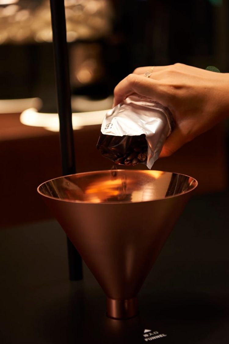 好みの豆が入ったカプセルを手に入れたら、次はコーヒーを挽く作業に。挽いた豆はグラインドカウンターの下にセットされたドリッパーに直接落ちていくのでとてもスムーズ。挽き終わりは取り出し口のライトがサインとなり知らせてくれる。
