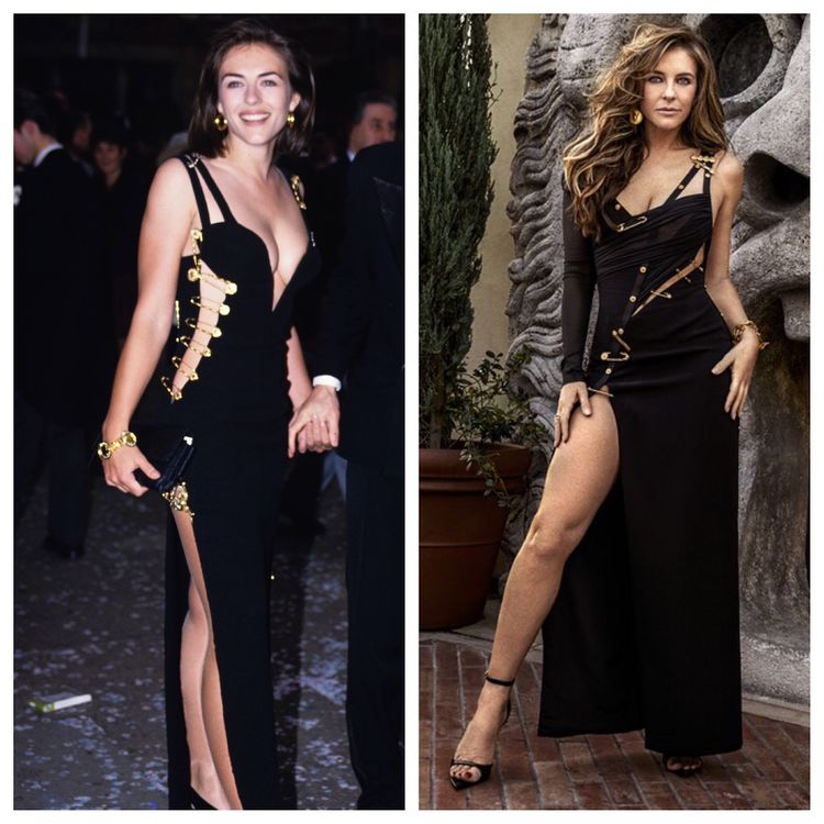 エリザベス・ハーレイの最もアイコニックなドレスのひとつだと言えるのは、1994年の映画「フォー・ウェディング(Four Weddings and a Funeral)」のプレミアで着用した「ヴェルサーチェ」の“安全ピンドレス”だろう。その25年後、ハーレイは「ヴェルサーチェ」の2019年プレ・フォール・コレクションからリメーク版の“安全ピンドレス”を着用し、雑誌「ハーパーズ バザー(Harper’s BAZAAR)」の4月号に登場した。