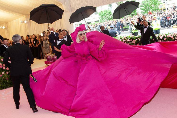 “キャンプ”を体現できる人がいるとすれば、それはレディー・ガガ(Lady Gaga)ではないだろうか。今年の「メットガラ(MET GALA)」で共同ホストを務めたガガは、大きく波打つようなシルエットを作り出すホットピンクのドレスで登場し、「メットガラ」でのガガのすべての衣装を手掛けたデザイナー、ブランドン・マックスウェル(Brandon Maxwell)と共にポーズを取った後に脱衣ショーを開催。衣装を次々と脱ぎながら全4ルックを披露した。