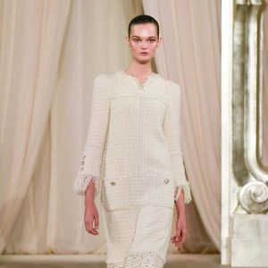 1924年、スコットランド旅行中に第2代ウェストミンスター公爵が猟で着用していた素材を女性用スーツに用いた。56年には、ブレードを施したツイードのスーツをコレクションで発表。やがて女性の憧れる服に。カールはTシャツやデニムに合わせられるモダンスタイルを継承した。