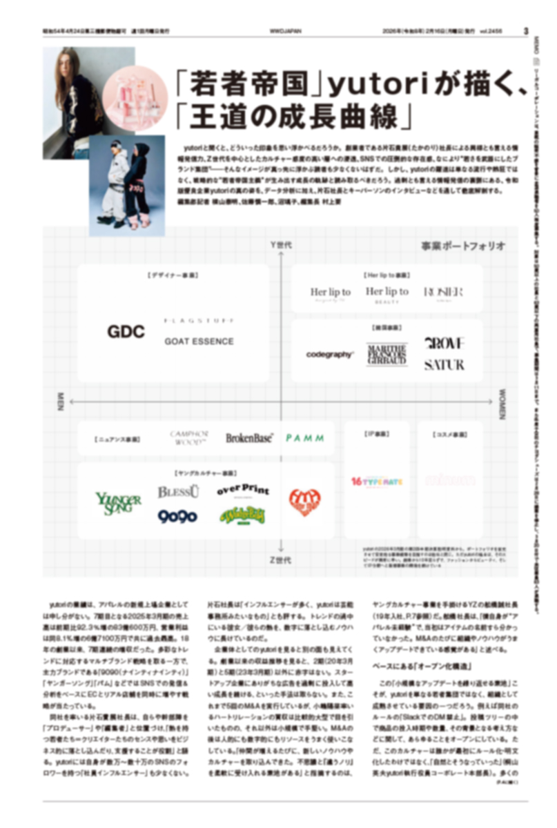 「WWDJAPAN」2月16日号は、「yutori特集」です。yutoriと聞くと、どういった印象を思い浮かべるでしょうか。創業者である片石貴展(たかのり)社長による異様とも言える情報発信力、Z世代を中心としたカルチャー感度の鋭い層への浸透、SNSでの圧倒的な存在感、そして“若さを武器にしたブランド集団“――そんなイメージが真っ先に浮かぶ人も少なくないはずです。しかし、yutoriの躍進は単なる流行や熱狂ではなく、戦略的な“若者帝国主義“が生み出す成長曲線として読み取るべきです。過剰とも言える情報発信の裏側にある、令和版優良企業yutoriの真の姿を、データ分析と片石社長に加え、5人のキーパーソンインタビューの通して徹底解剖します。
