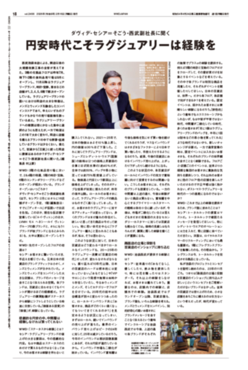 ニュースでは、かつての勢いを失った百貨店のインバウンドの今とこれから、さらにいま百貨店の要注目キーパーソンであるそごう・西武のダヴィデ・セシア(Davide Sesia)副社長のインタビューをお届けします。