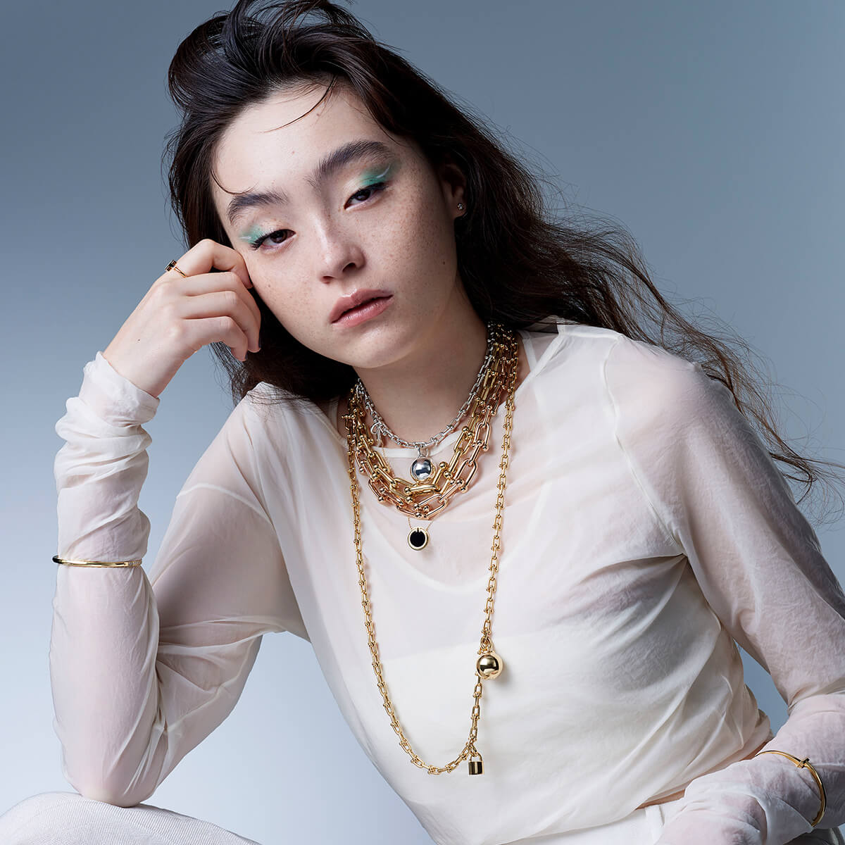 現代に生きる人の強さとしなやかさを表現した“ティファニー ハードウェア”。ニューヨークの都会的なエッセンスとストリートのエッジィなカルチャーから着想を得たパワフルなジュエリーは、身に着ける人の個性を際立たせてくれる。同コレクションは、ピアス、ネックレス、ペンダント、ブレスレット、リングと幅広いバリエーションをラインアップ。単体はもちろん、異なるデザインや素材を重ねるなど、自由自在なスタイリングによって独創的な対比を生み出してくれる。彫刻のように美しく聡明なジュエリーの輝きを手元や胸元、指先に宿して唯一無二のバランスを完成させたい。