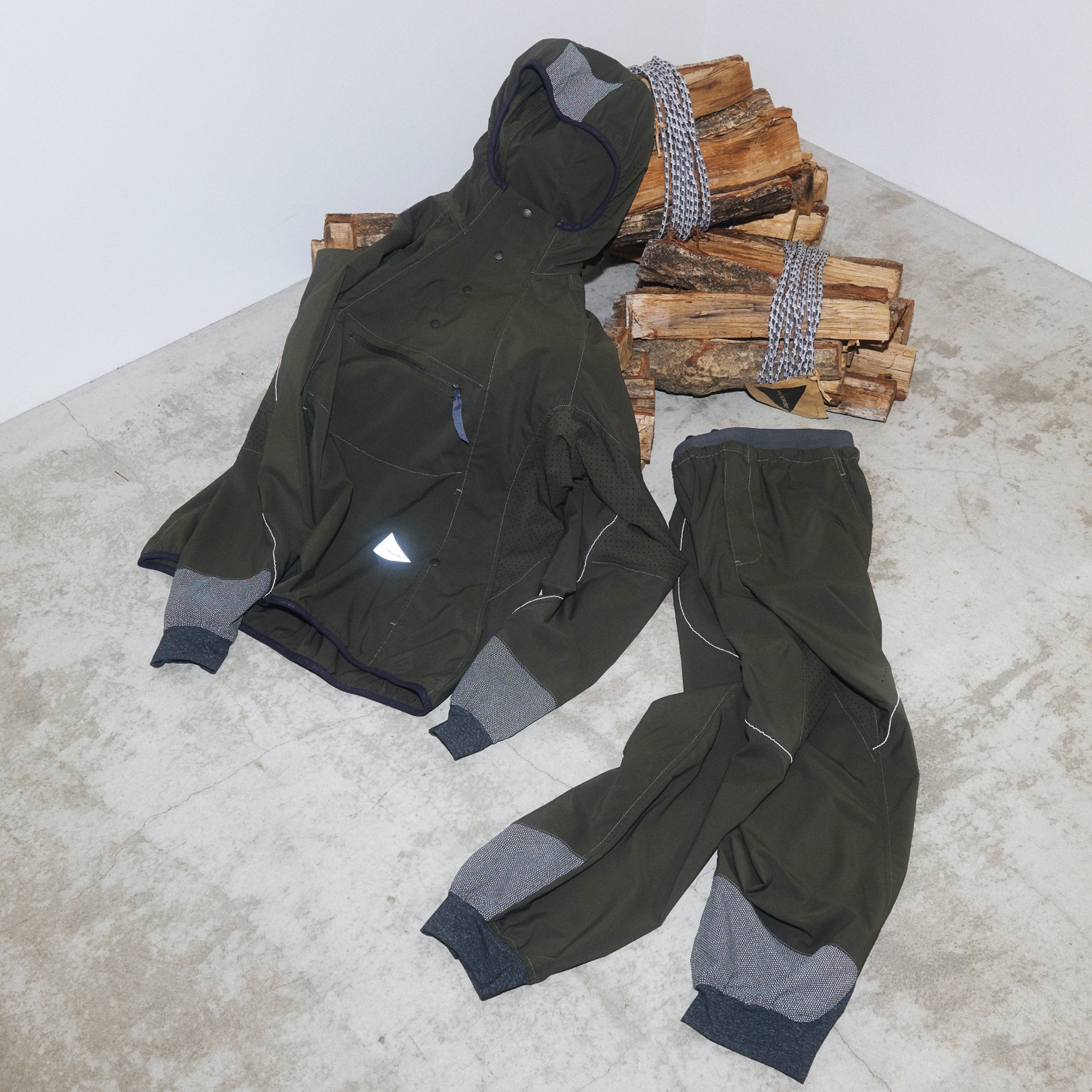 レインジャケット 7万1500円、カットソー 1万8700円、パンツ 2万5300円、キャップ 1万5400円、グローブ 1万 4300円、ツールバッグ 1万2100円、スニーカー(アンドワンダー × サロモン)2万6400円/以上アンドワンダー