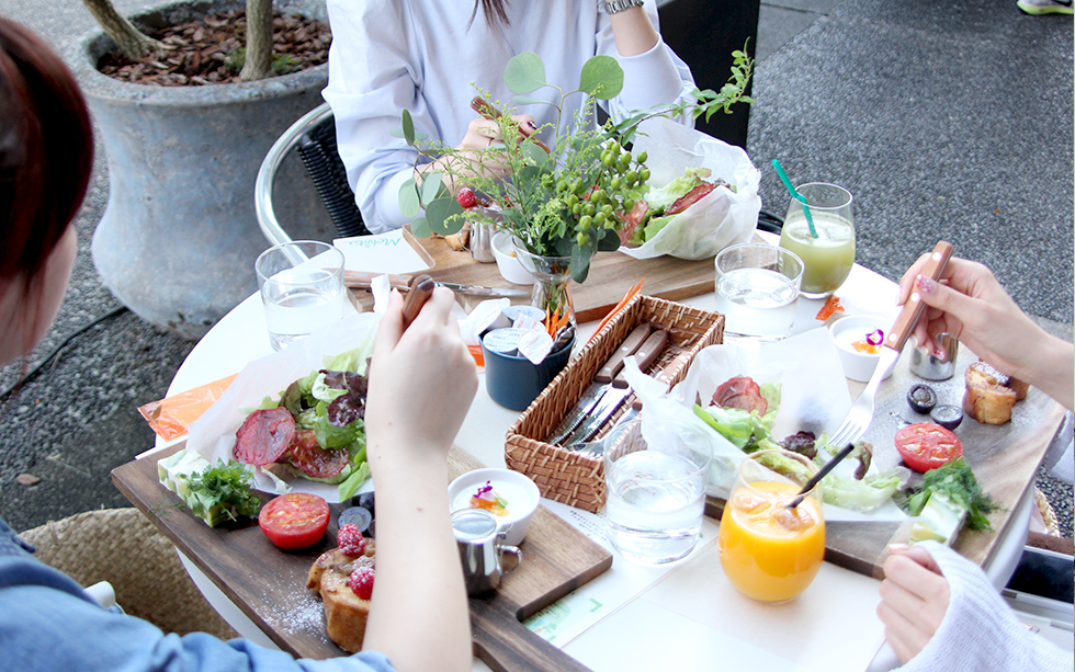 イベントのために用意されたオーガニックサラダプレートにもブランドのこだわりがたっぷり詰まった。「完熟アボカドとサワークリームのテリーヌ」は、食用のアルガンオイルが使われ、アボカドの滑らかさとサワークリームの爽やかな酸味の中にオイルのまろやかさが際立つ。フレンチトーストには、ブランド創業者が養蜂家でもあったことから発売している「アカシアハニー」が添えられた。また、ゲストには体質チェックシートを記入してもらい、「マンゴーオレンジ」「アサイ―バナナ」「青汁リンゴ」から各自に合ったドリンクを提供。色鮮やかなプレートとドリンクを柔らかな日が差し込むテラス席で味わった。