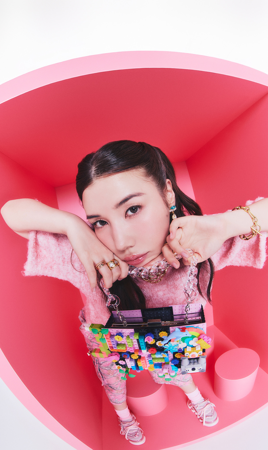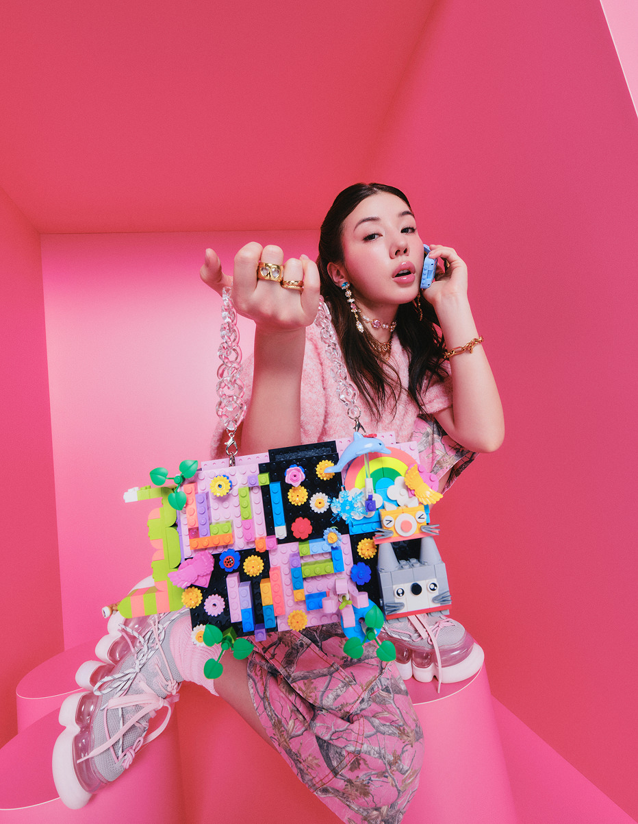 ファッションアイコンとしても活躍する仲は、レゴ®︎ブロックでバッグをデコレーション。“LOVE”の文字と共に、愛猫の“おかか”と“きなこ”など、好きなモチーフをつめ込んだ。