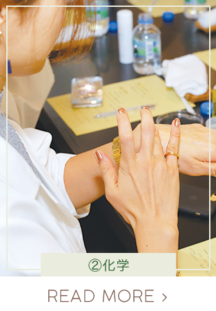 2時間目は「化学」。机の上に置かれた2つのシャーレー。1つにはヒマシ油を、もう1つにはアルガンオイル。指を使って2つのオイルの違いを実感。ヒマシ油は粘り気が、アルガンオイルはさらっとした触り心地。森田“博士”の説明にゲストも納得。