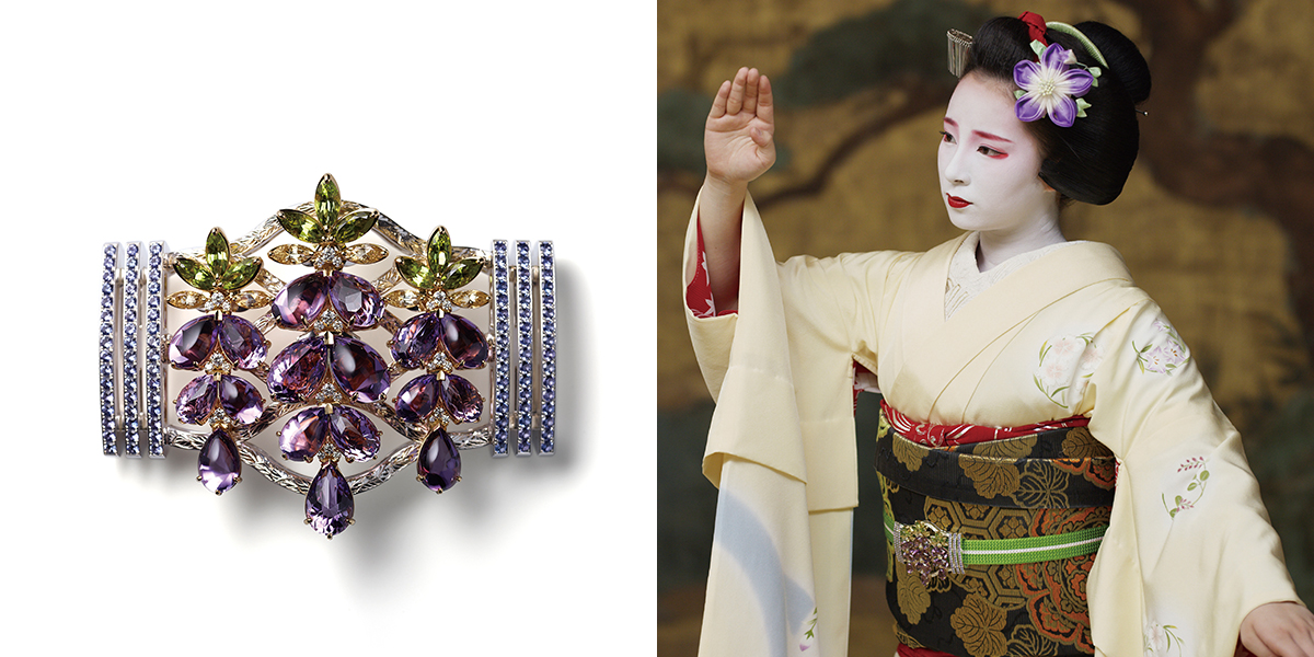日本の美や伝統を伝える「NIWAKA」がハイジュエリーを披露する場所に選んだのが、東京国立博物館・法隆寺宝物館。ブランドカラーの紫に染められた会場は、京都という街の優雅なただずまいに通じるような空間だ。会場では、女優の中谷美紀が「NIWAKA」の魅力について語った他、舞妓の優美な踊りや、日本人ならではの精緻かつ洗練されたジュエリーを間近に鑑賞し、ため息の出るような美しさに来場者は酔いしれていた。
