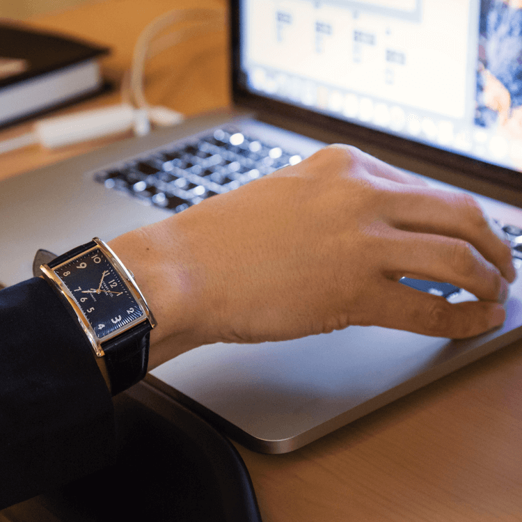 「僕の仕事時間は、はっきり言って不規則。現場で作業がある時なんかは、深夜から朝6時くらいまで働き、そのまま10時から打ち合わせに参加することも。なので、なるべくストレスフリーになれる仕事環境が大切ですね。集中したい時は個室に入り、気分に合わせて好きなBGMを流しています。体のことを考え、服装は動きやすいものが多いです。ワードローブは黒色と紺色の服がほとんどなので、シンプルで合わせやすいネイビーの時計を選びました」