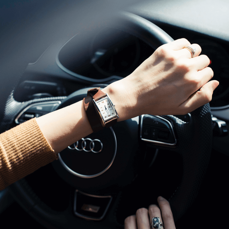 「ドライブが好きなので、週末は主人と運転を交代しながら子供と一緒に遠出をすることが多いですね。平日の朝も、早めに出発して代官山や銀座あたりでモーニングデートを兼ねてみたり(笑)。カジュアルなデニムスタイルが定番の私にとって、時計は大人の女性らしさと強さを表現するシンボルであり、宝石のような一生もの。90度回転させた文字盤は運転の時にも見やすいので、ドライビングウォッチとしてもベストですね」
