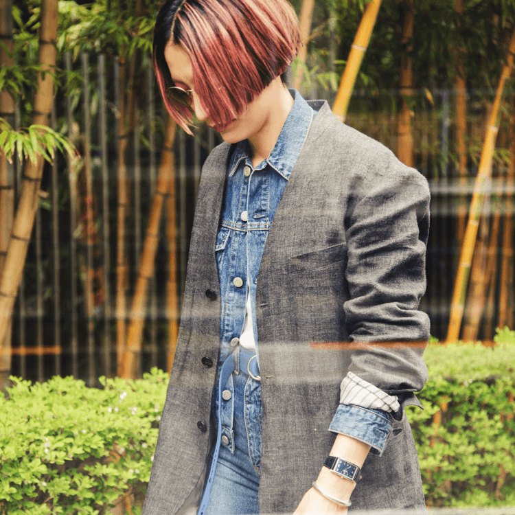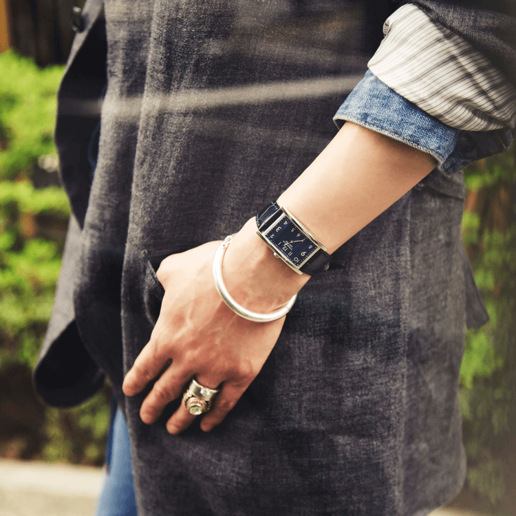 「カフェなどで休憩するよりも、街中をふらっと自由に歩くことが私なりのリフレッシュ法。オフモードの時はできるだけ身軽でいたいので、携帯や財布など必要最低限のものだけポケットに入れ、バッグはほぼ持ち歩きません。この春夏はデニムのセットアップスタイルを楽しみたい気分だったので、時計もデニムに映えるシックなブルーをセレクトしました。ブルーはもともと大好きな色。どこかメンズライクなムードも自分らしい感じで好みですね」