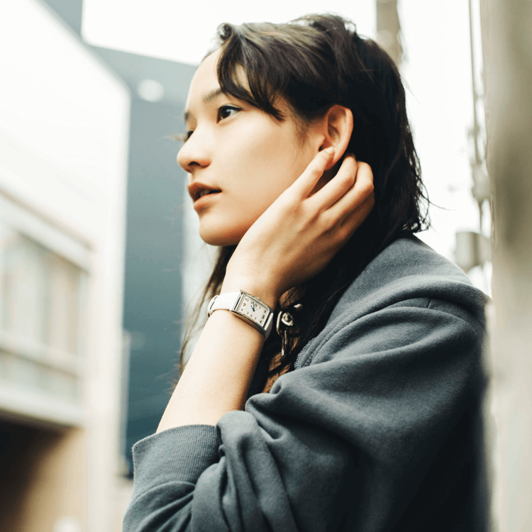 「今はニューヨークに住んでいるので、帰国した時は代々木八幡あたりで朝からのんびり、気取らないデートをするのが落ち着きますね。オシャレなショップもたくさんあるので、来るたびに新しい発見があるんです。今日のコーデはデニム素材のワンピをメインに、手元はホワイトの時計でモード感をプラスしました。最近、特に小物選びでパッと目に入るのがホワイト。大人っぽくて女性らしい雰囲気が素敵だと思います」