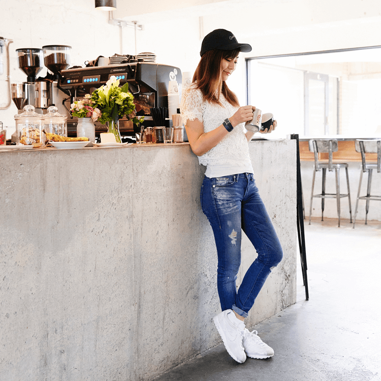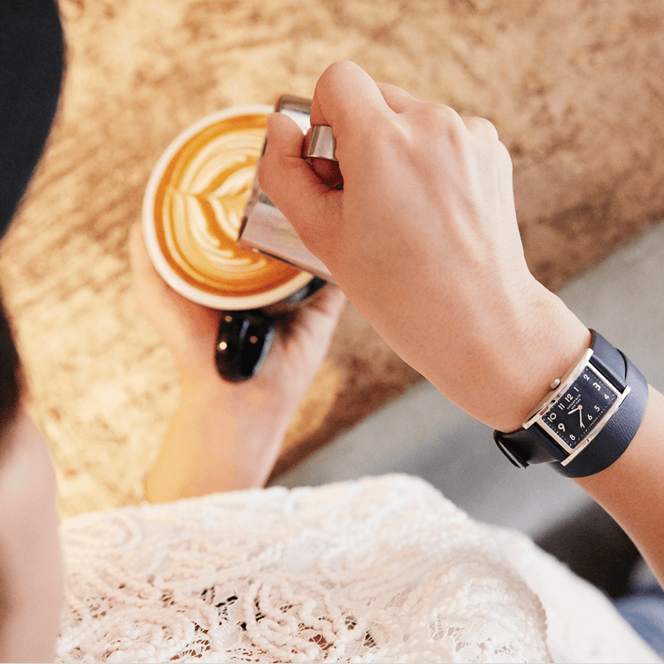 「たまたま打ち合わせで訪れたコーヒーショップ『ラテスト』のラテアートに惚れ込み、バリスタとしてお店で働き始め、好きが高じて今ではラテアートの世界大会に出場するほど上達しました。朝の気持ち良い光を感じながらラテアートを作る時間は、私にとって癒しの時間。服装もリラックス感を大切に、キャップを合わせてユニセックスなスタイルに仕上げました。カジュアルな服装にもさりげなく馴染むブルーの時計がポイントです」