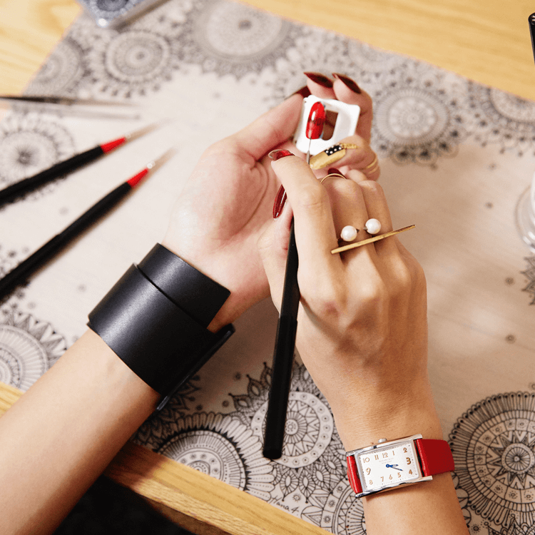 「最近は同じ毎日を過ごすルーティーンワークから、ネクストステップとして、“残す仕事”を行っています。アトリエでネイルチップに作品を残したり、また、雑誌の取材や伝統工芸を広めるための作品活動など、“人と時間を繋ぎ止めること”を大切に休みなく行動しています。ファッションは、基本的にはシンプルな白や黒の服に、ポイントとして赤を取り入れることが多いですね。今日は時計とネイル、リップで赤をリンクさせてみました」
