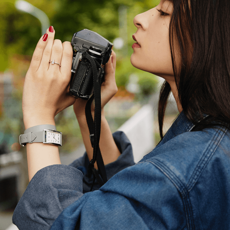 「フィルムカメラをはじめたのは、去年の10月頃。こうやって渋谷の歩道橋から青空を見上げたり、おしゃれな人たちを眺めていると、ついシャッターを切りたくなりますね。ファッションも大好きで、コーディネートのポイントは、時計の文字盤とワンピースの花柄をピンクで統一したところ。ティーンの私にとって、腕時計を見るという仕草は大人の象徴のようで憧れます。20歳になったらもっとこの時計が似合う大人の女性になっていたいな」