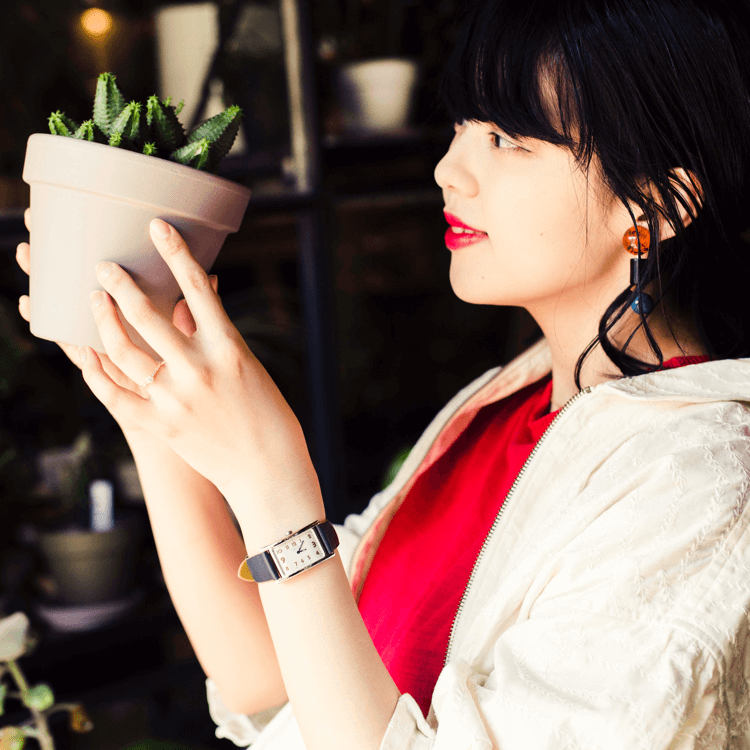「観葉植物が好きなので、休日にはよくプラント専門ショップへ出かけています。店内にはギッシリと植物がディスプレーされていて、1000以上の植種があり、いつ訪れても飽きません。いろいろと眺めていたら時間がたつのを忘れてしまうくらい!ファッションは、ボタニカル柄の刺繍を施したアウターを主役に。手元のさりげないアクセントとして、遊び心のきいたグレー×イエローのバイカラーストラップの時計をセレクトしました」